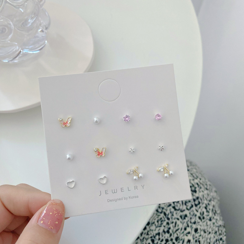s925银针超仙蝴蝶小清新樱桃一周耳钉套装粉嫩少女心ins韩风耳环
