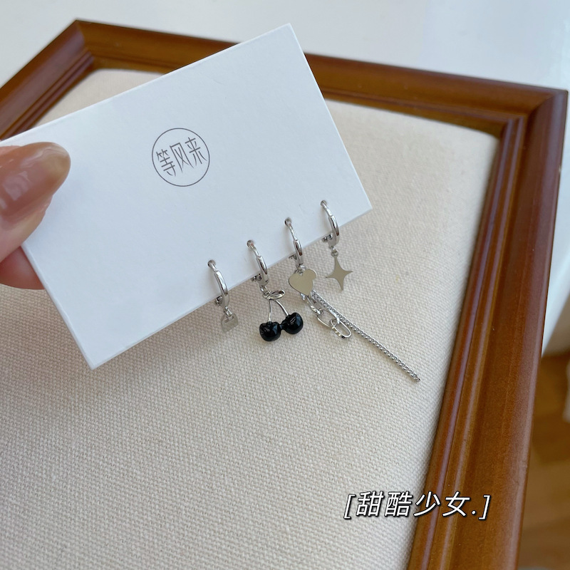 黑色小樱桃耳圈套装组合简约爱心链条耳环法式高级感ins耳扣耳钉