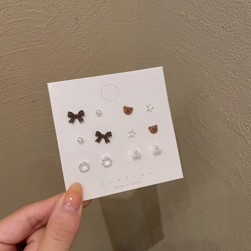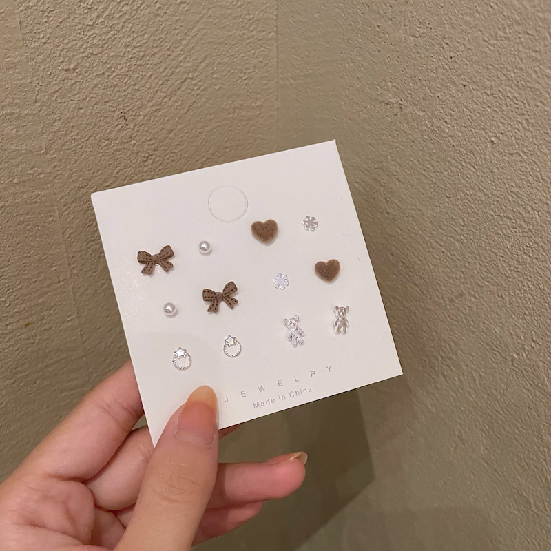 韩式s925银针咖色蝴蝶结秋冬小熊耳钉套装少女气质可爱养耳洞耳环