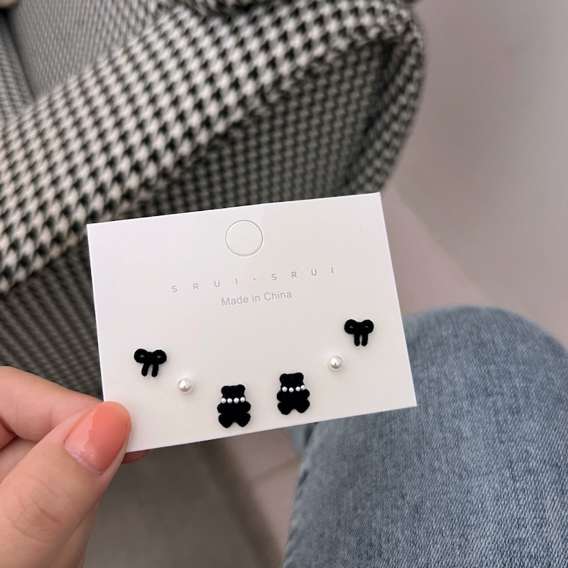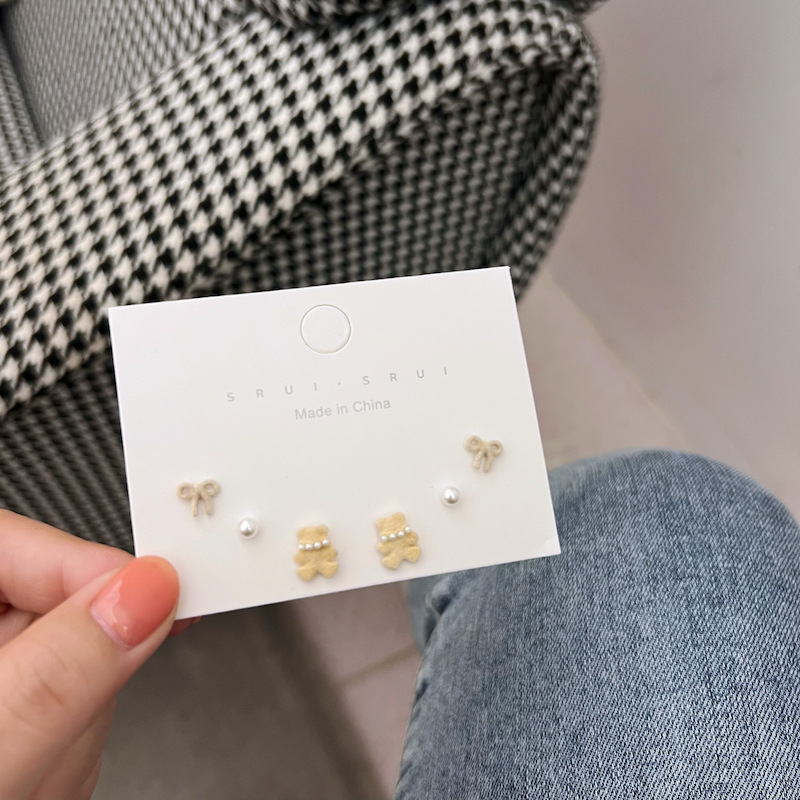 s925银针时尚爆款秋冬卡通植绒珍珠小熊耳钉套装女蝴蝶结气质耳环