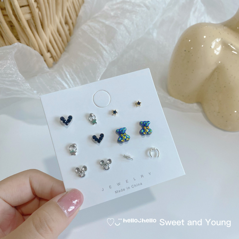 暗黑酷帅爱心领结小熊耳钉套装925银针简约冷淡风小众ins风耳环女