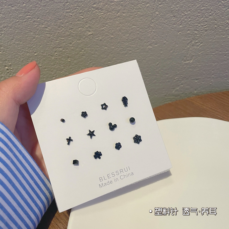 几何黑色塑料耳钉套装防过敏迷你养耳洞简约女小巧个性耳棒耳骨钉
