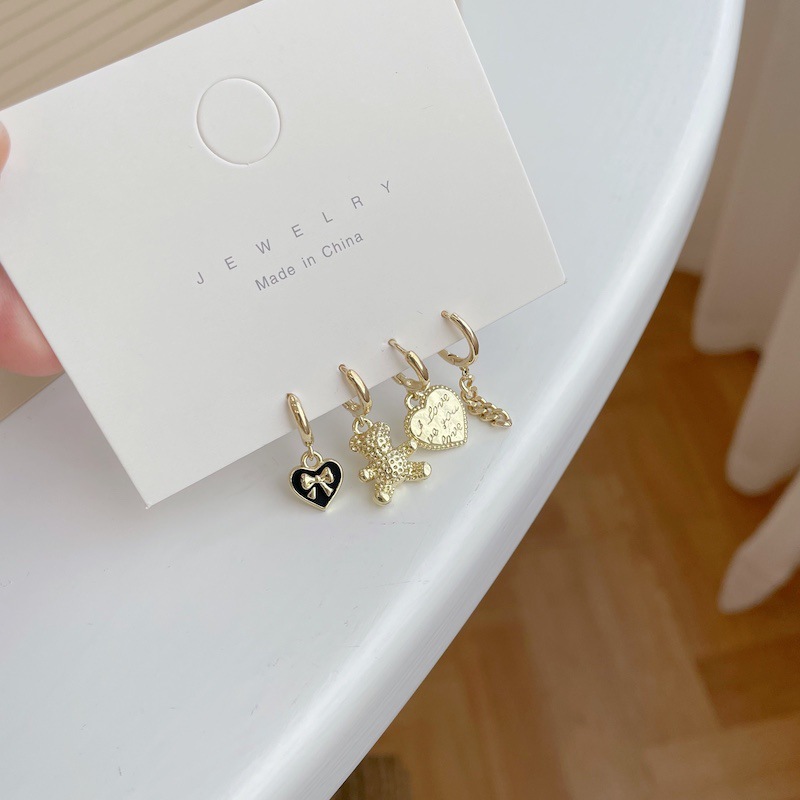 时尚小熊爱心链条耳扣组合套装14k金简约百搭高级感耳环ins风耳钉