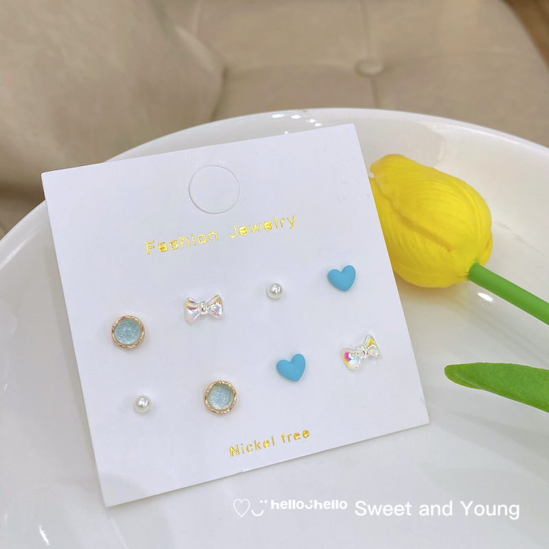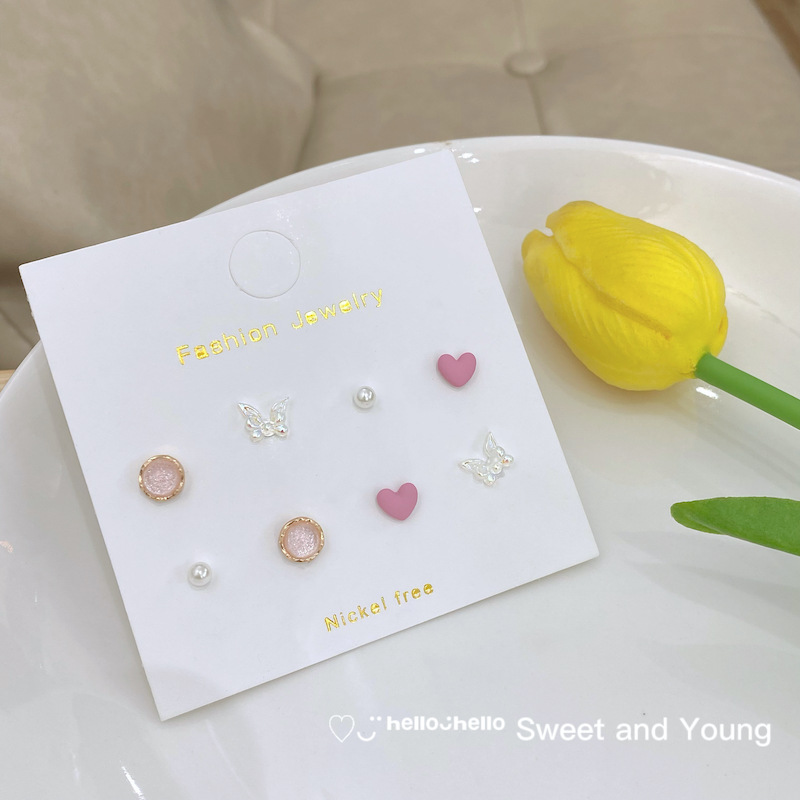 s925银针韩版精致小巧猫眼石耳钉女套装彩色清新蝴蝶彩色爱心耳环