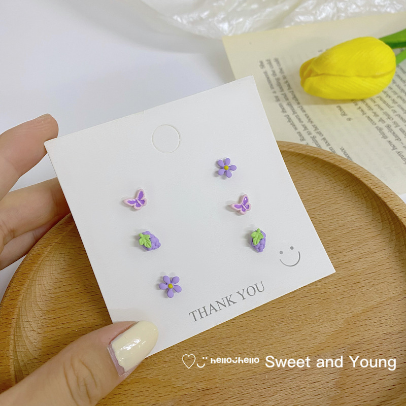 s925银针紫色葡萄花朵蝴蝶耳钉套装韩国可爱彩色小众设计感耳环女