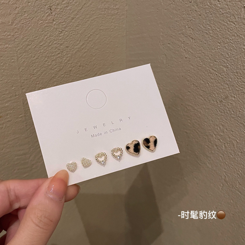 s925银针时尚秋冬复古豹纹爱心耳钉套装女气质小众设计感耳环耳饰