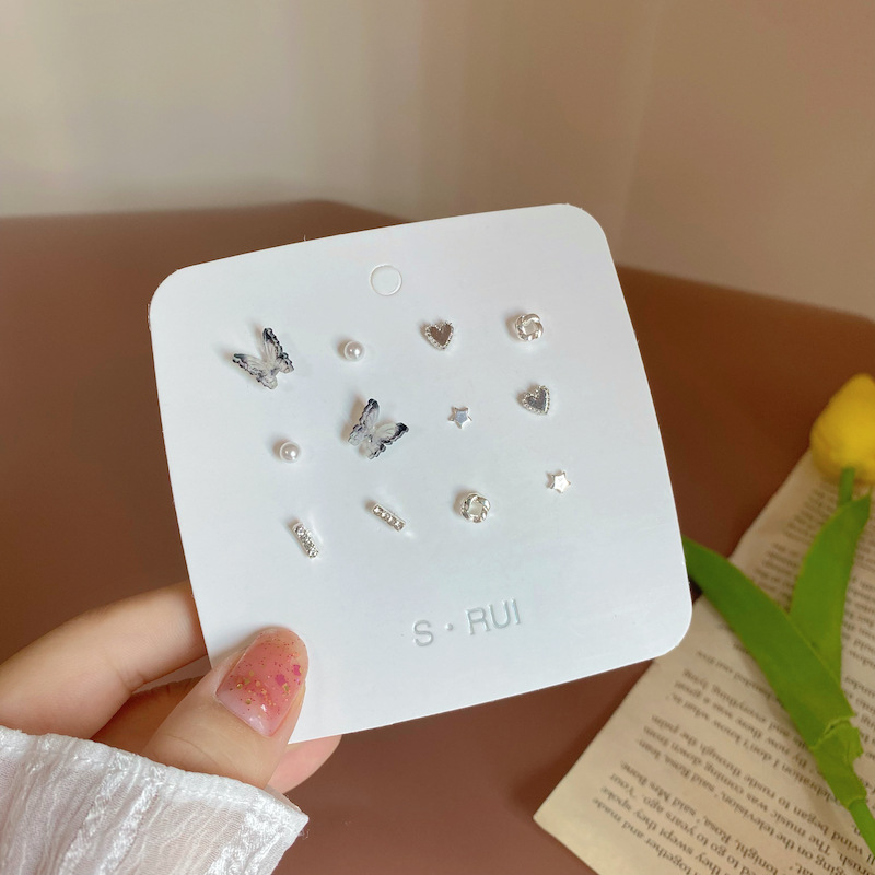 银针酷帅黑白立体蝴蝶耳钉套装简约女小巧几何冷淡风爱心耳环耳饰