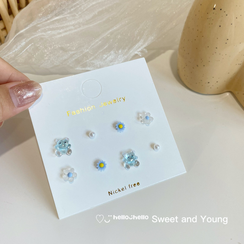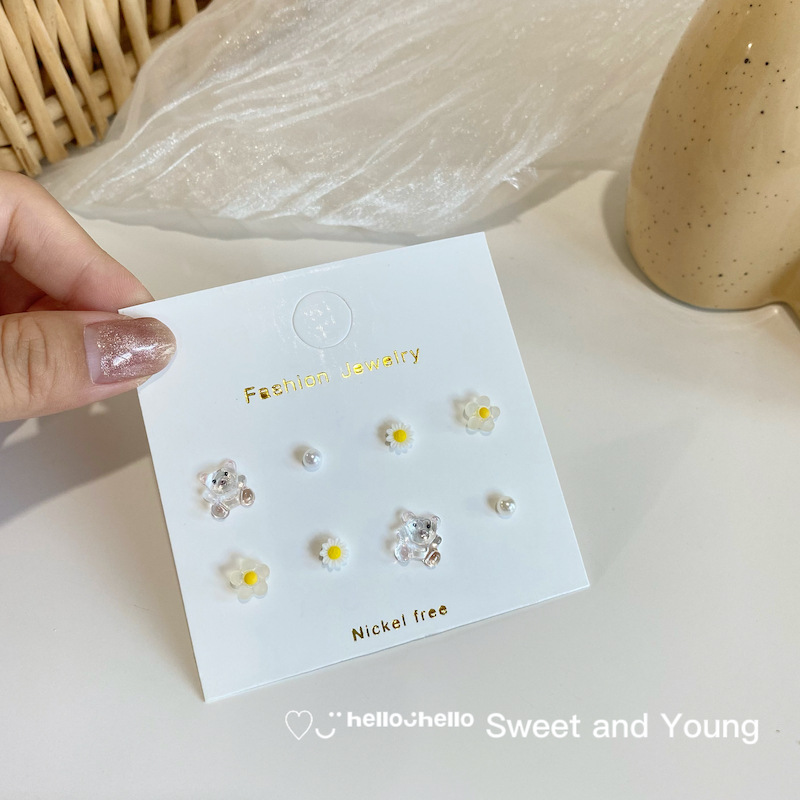 银针雏菊花朵小熊耳钉套装可爱夏季简约女小巧精致耳骨钉甜美耳环