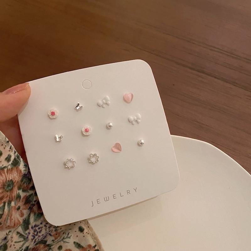 粉嫩花朵猫眼石爱心蝴蝶结耳钉套装组合少女心甜美时尚气质耳饰品