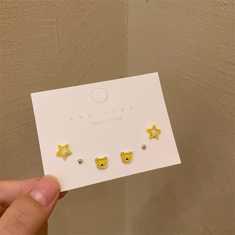 可爱ins萌熊小耳钉套装925纯银针布艺女格纹五角星小众设计感耳环