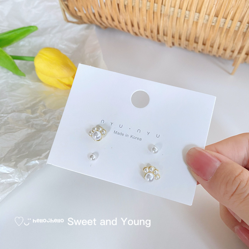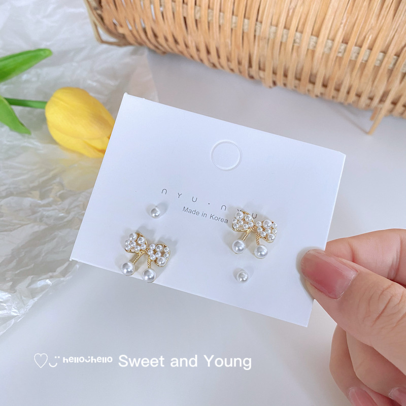 s925纯银甜美珍珠蝴蝶结猫爪耳钉两件套装女气质温柔韩式耳环耳饰