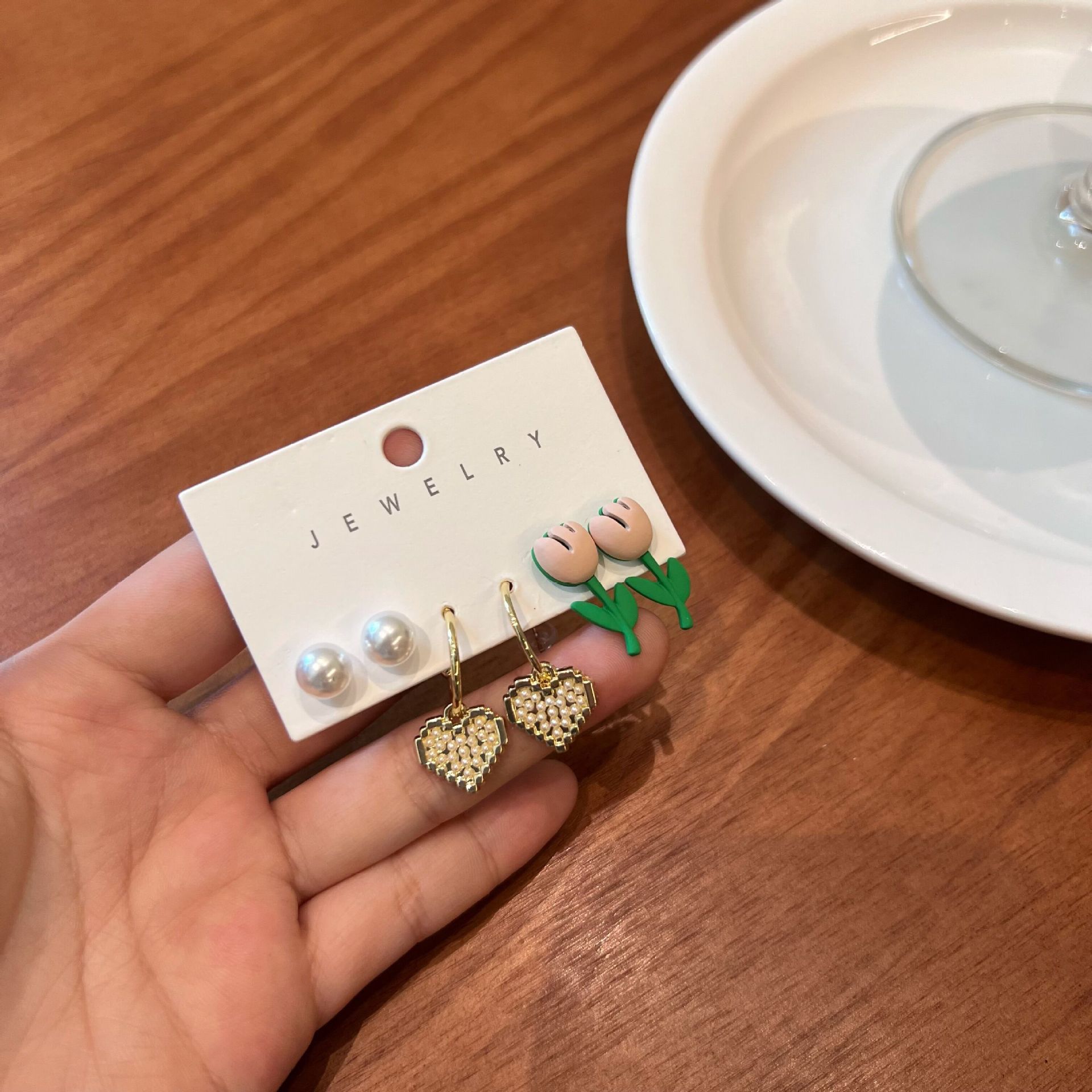 日韩郁金香耳环s925爱心珍珠创意甜美耳钉三件套2022年新款潮耳饰