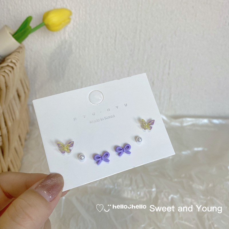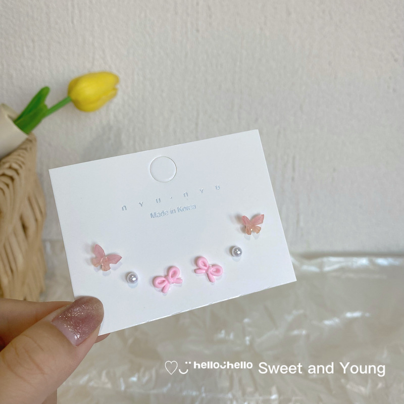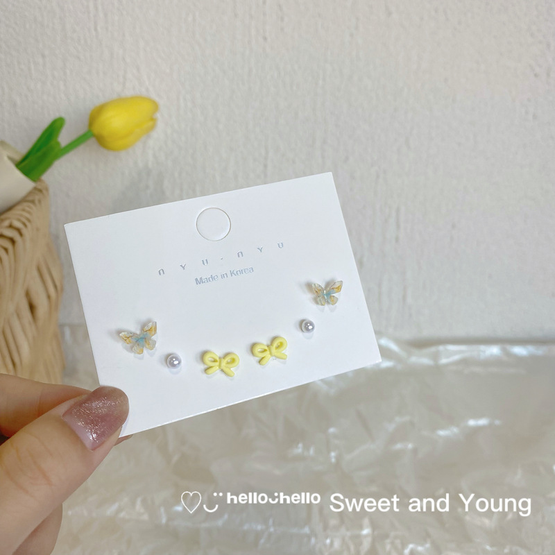 s925银针超仙糖果色立体蝴蝶结耳钉套装少女心简约小巧气质潮耳环