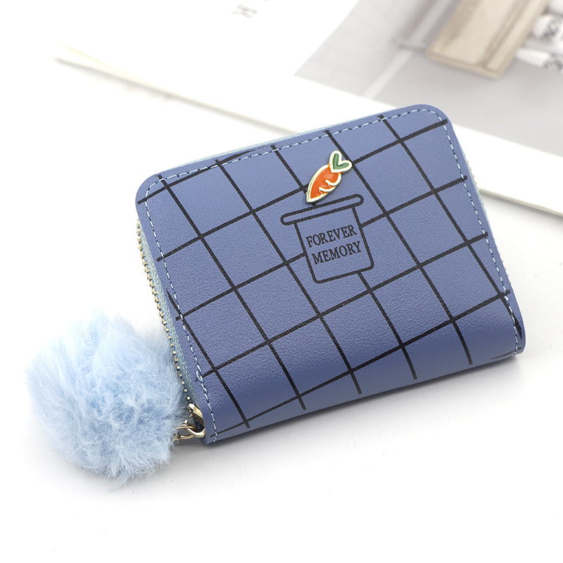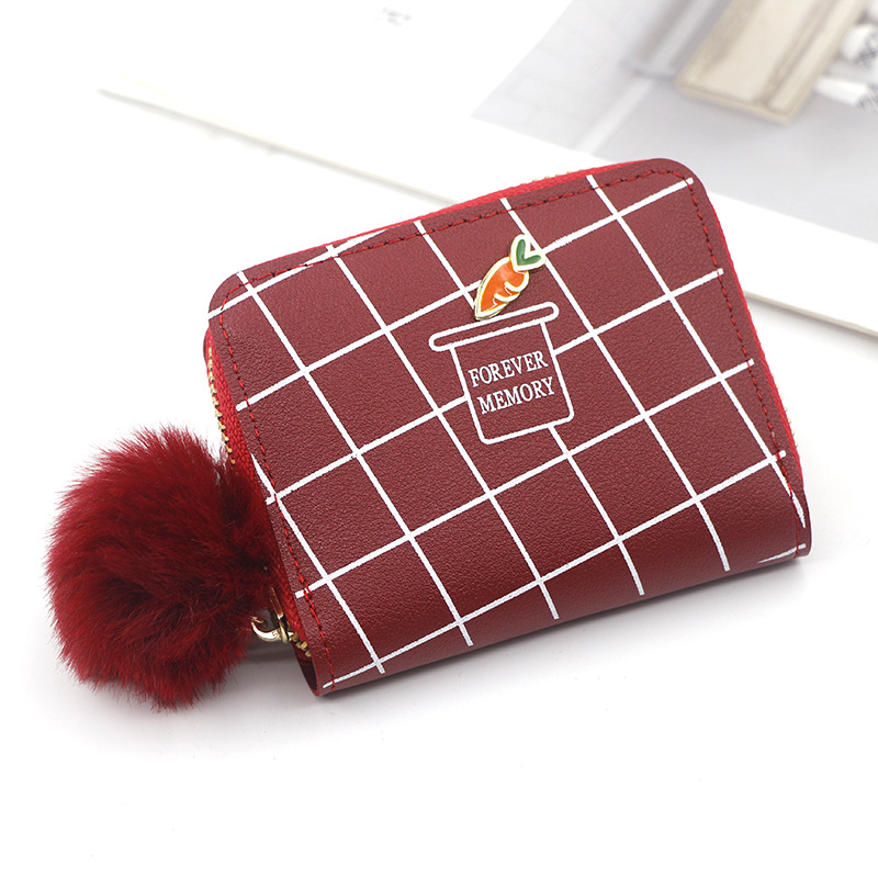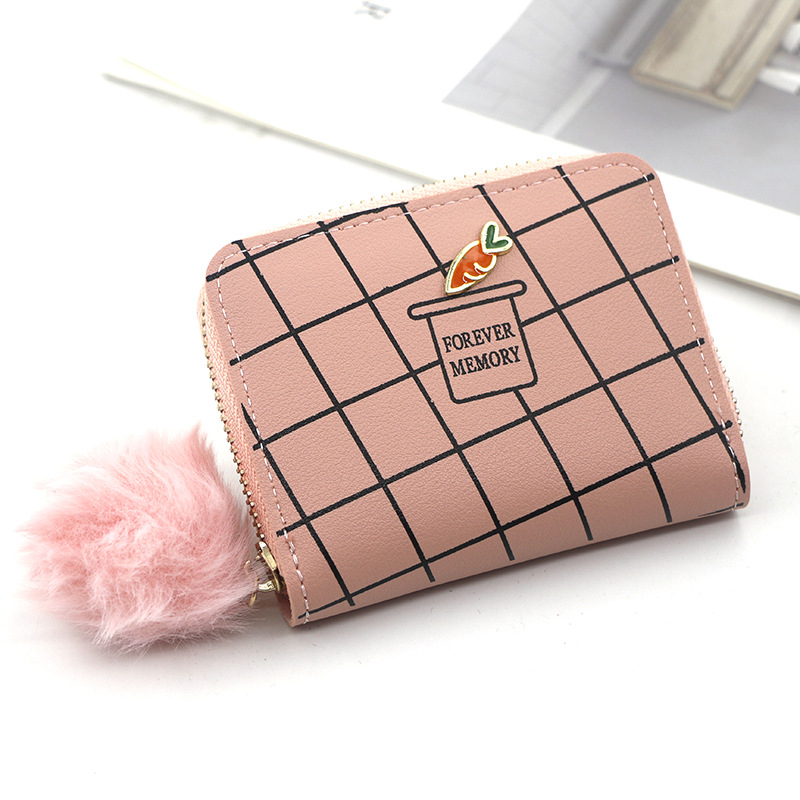 现货拉链包女士短款钱包可爱萝卜毛球小拉链短包零钱证件手拿包