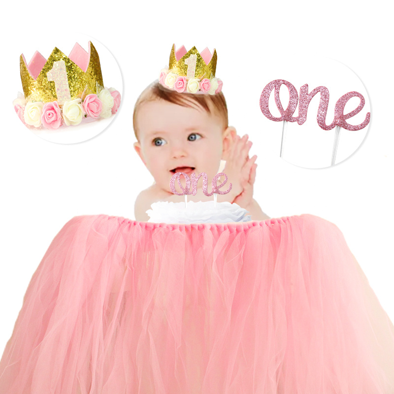餐椅旗宝宝周岁餐桌 高脚椅旗 粉色网纱 one插牌 1岁生日帽 帽子