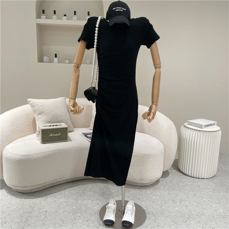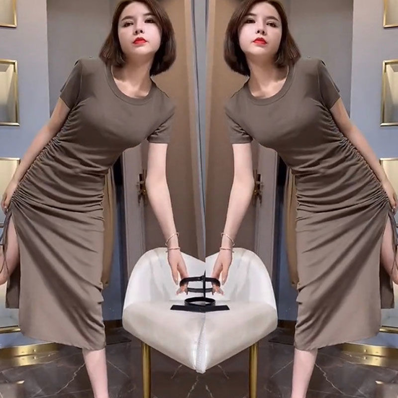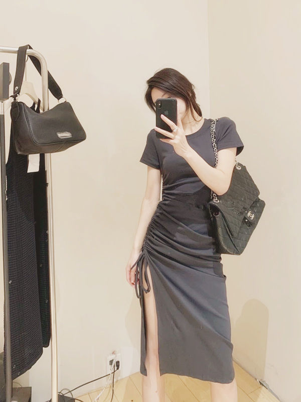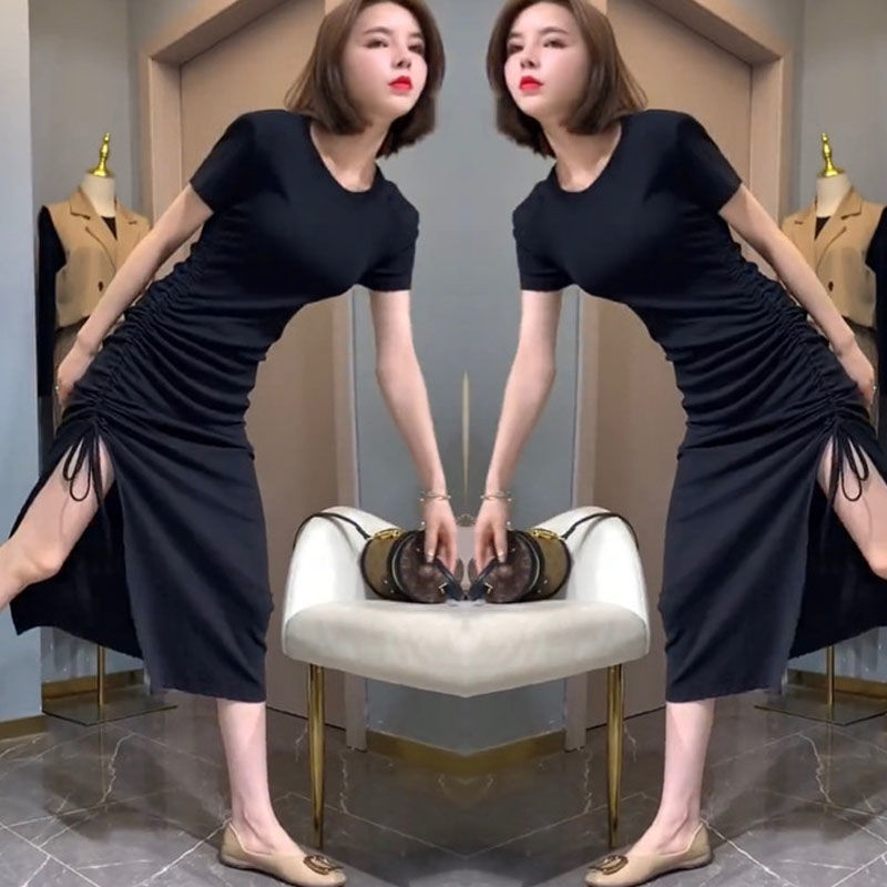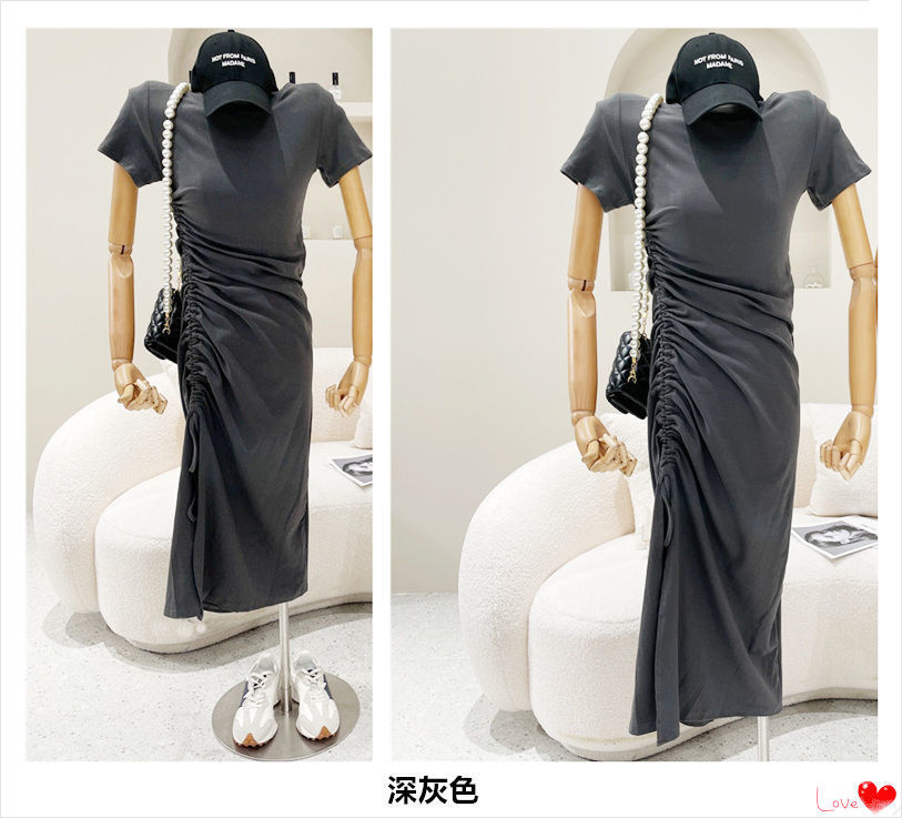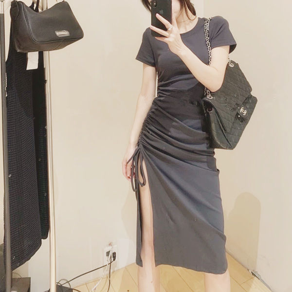 2022夏季弹力修身抽褶系带侧开叉中长款连衣裙女短袖T恤抽绳长裙