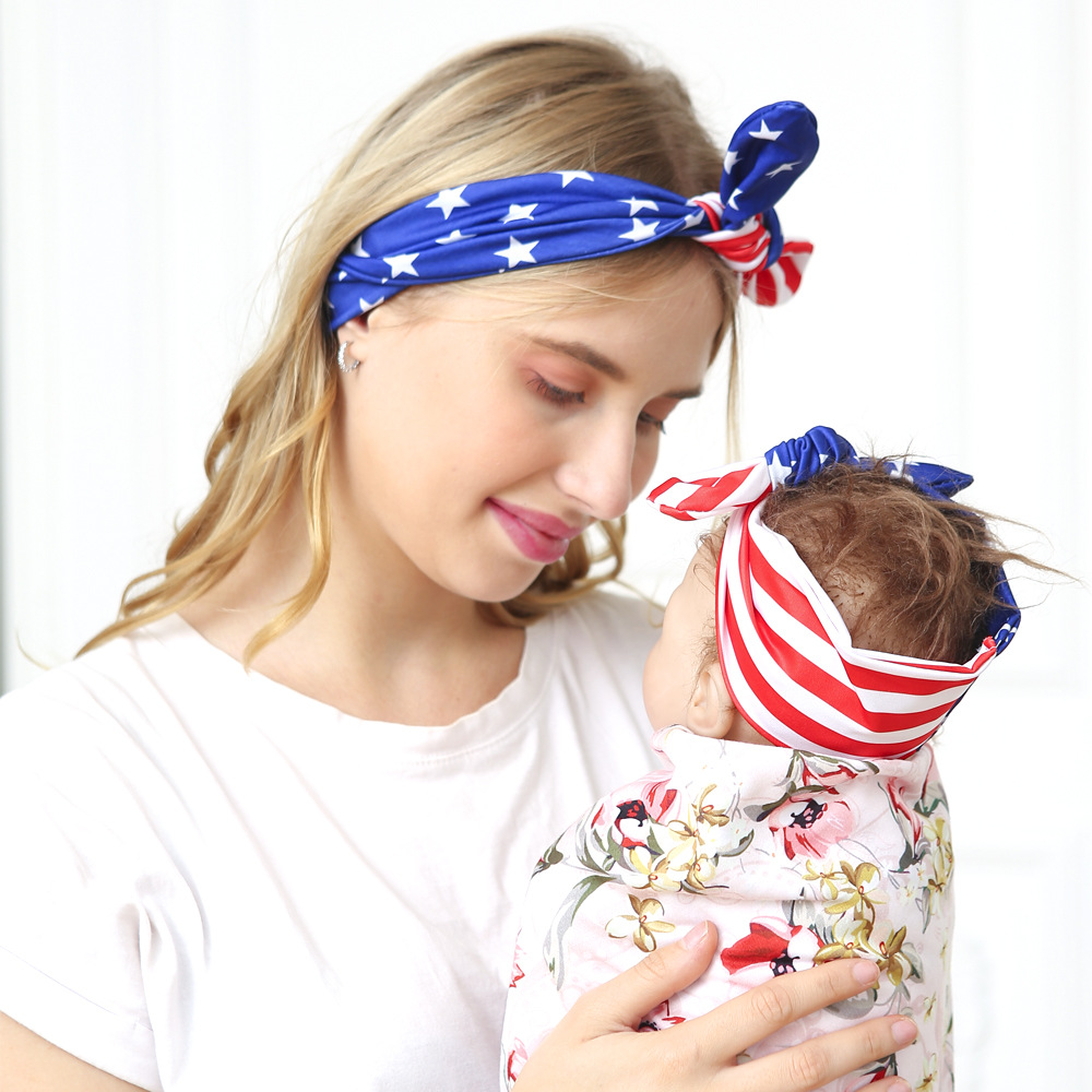 欧美印花母子头带套装红黑格子款婴儿发带亲子兔耳朵两件套