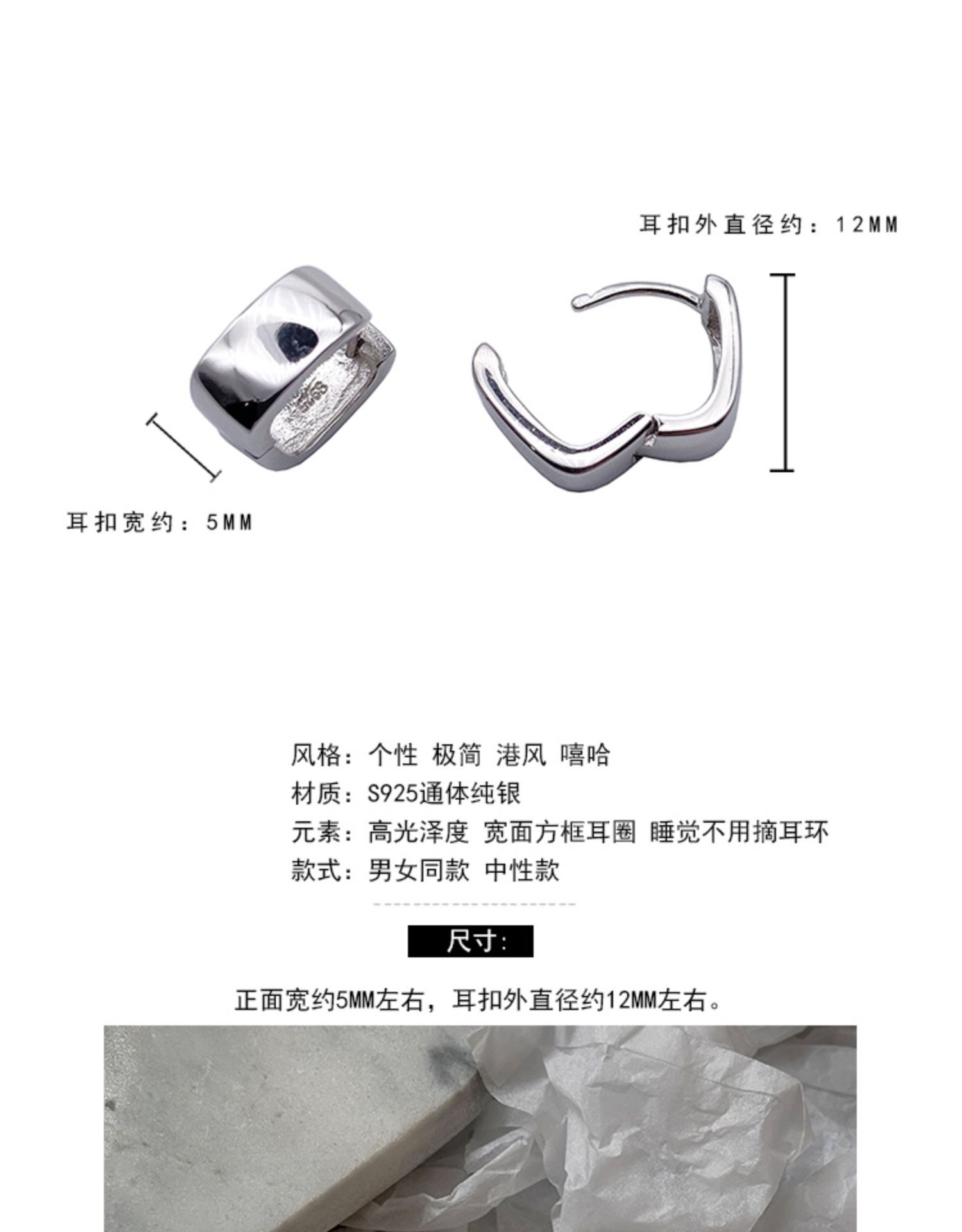 日韩s925纯银方块耳扣耳环男卡扣式宽面方形个性易戴不用摘耳圈女