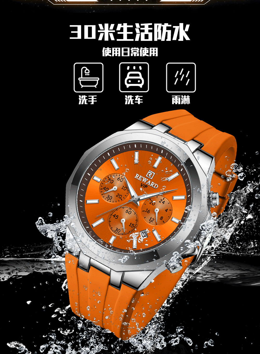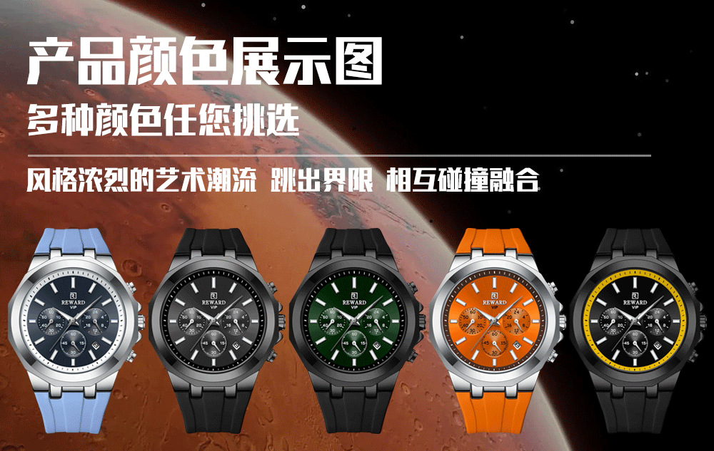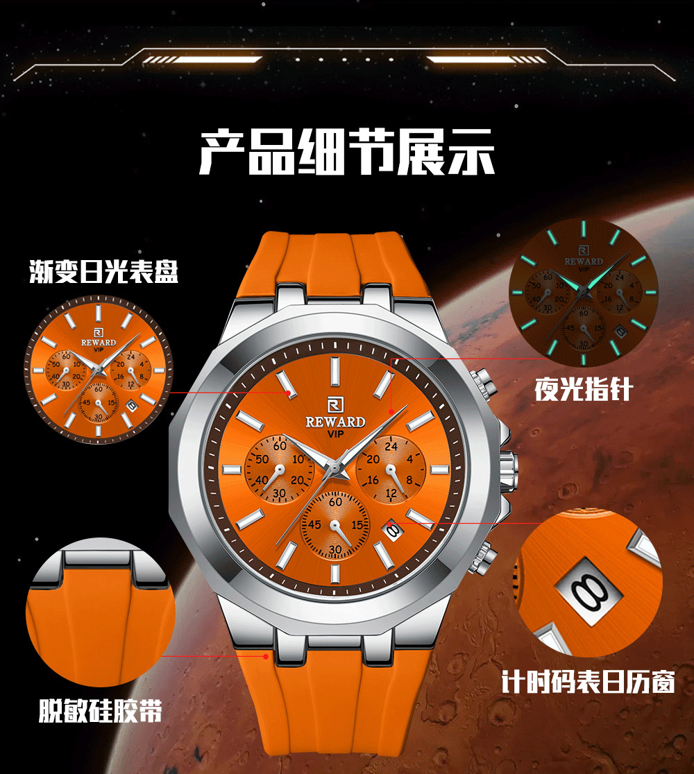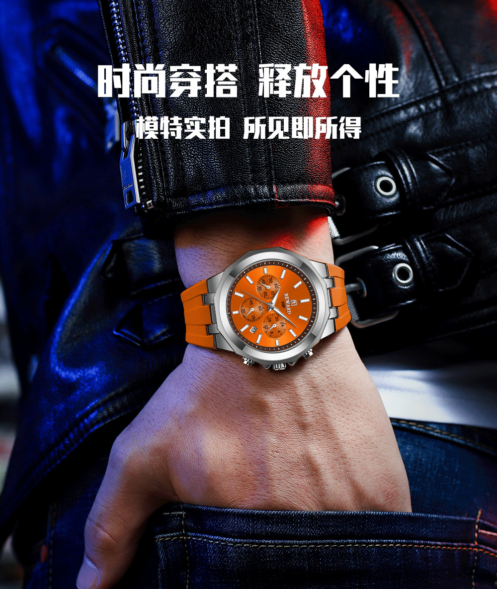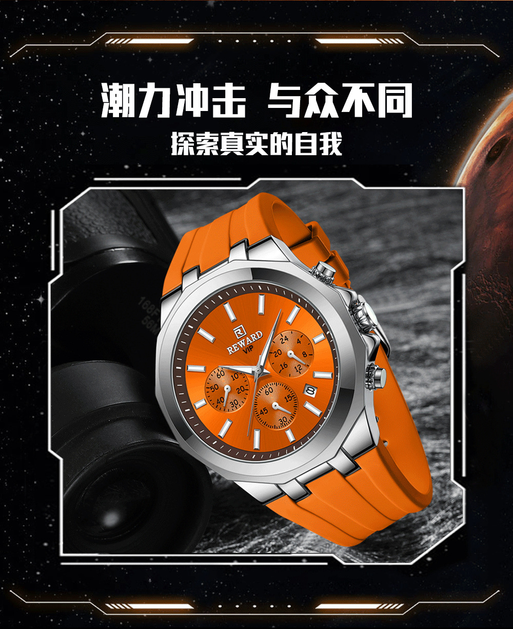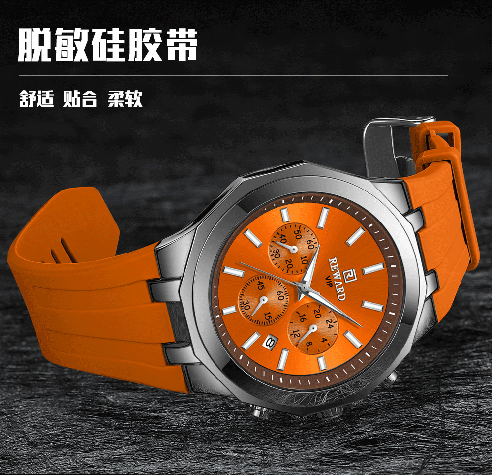 Reward亲肤硅胶带石英运动男表 跨境畅销多功能手表三眼六针日历