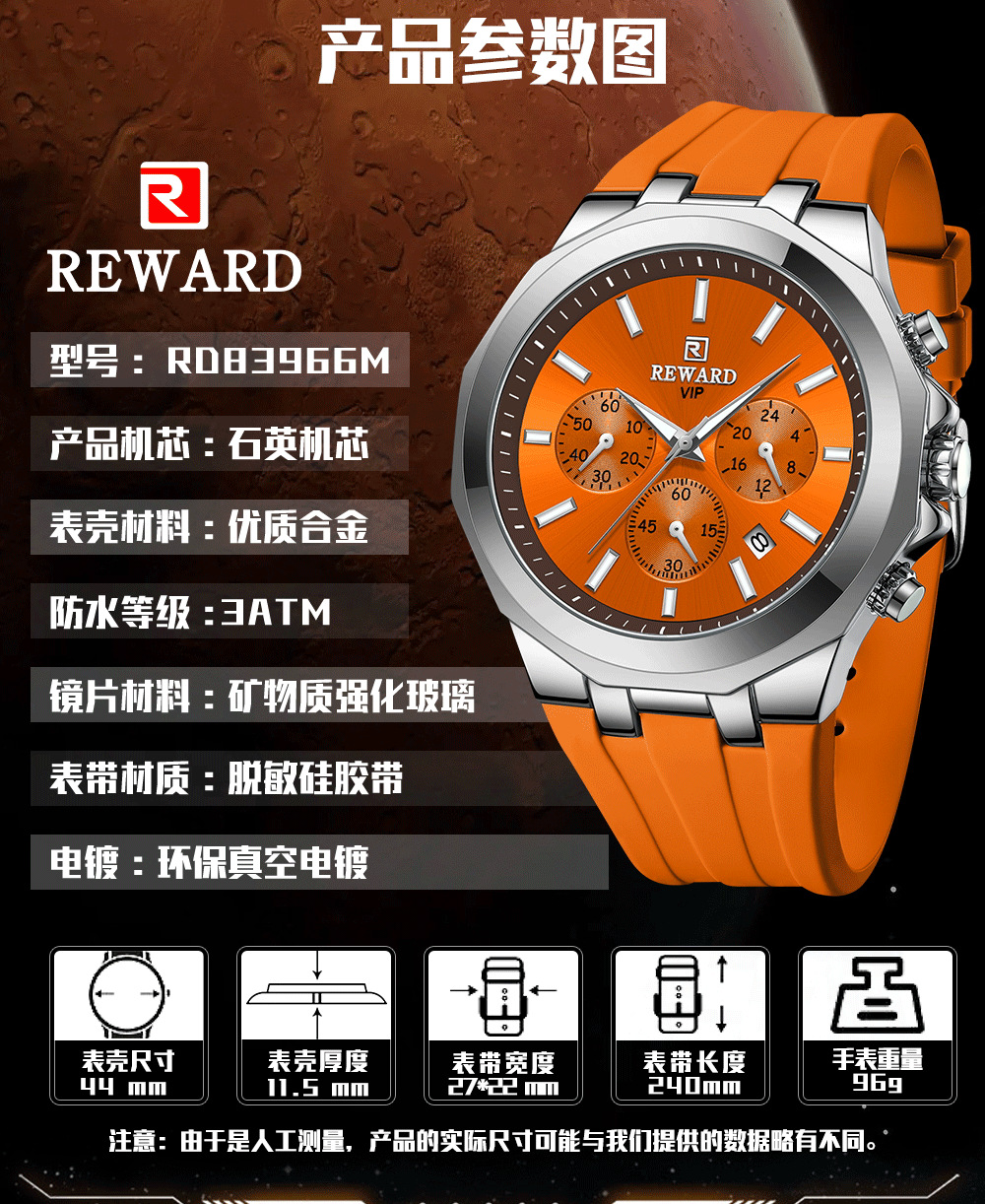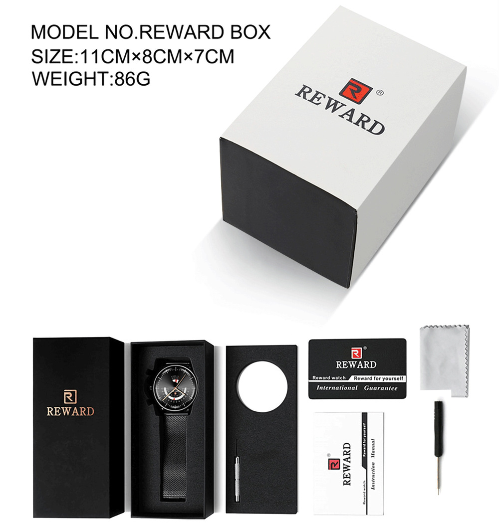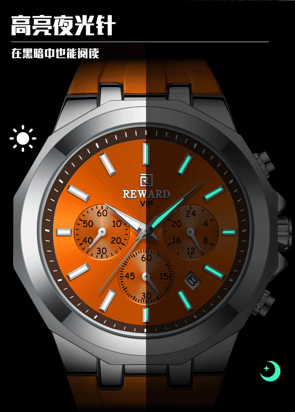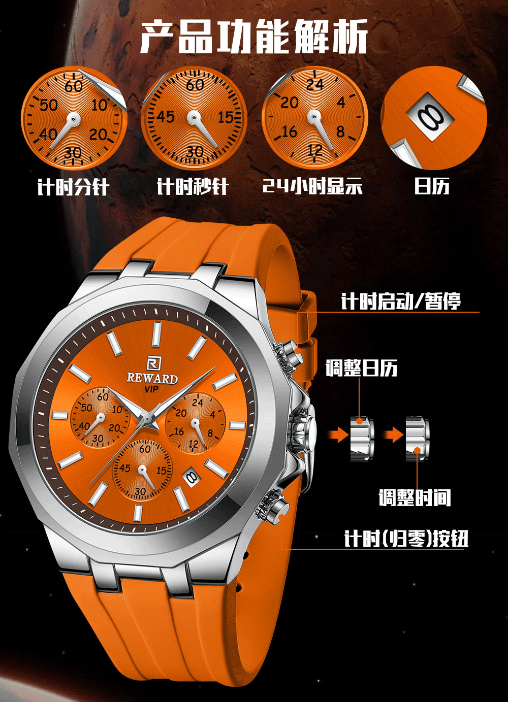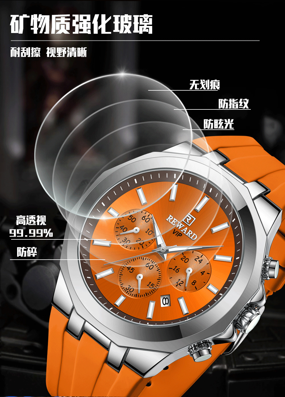 Reward亲肤硅胶带石英运动男表 跨境畅销多功能手表三眼六针日历