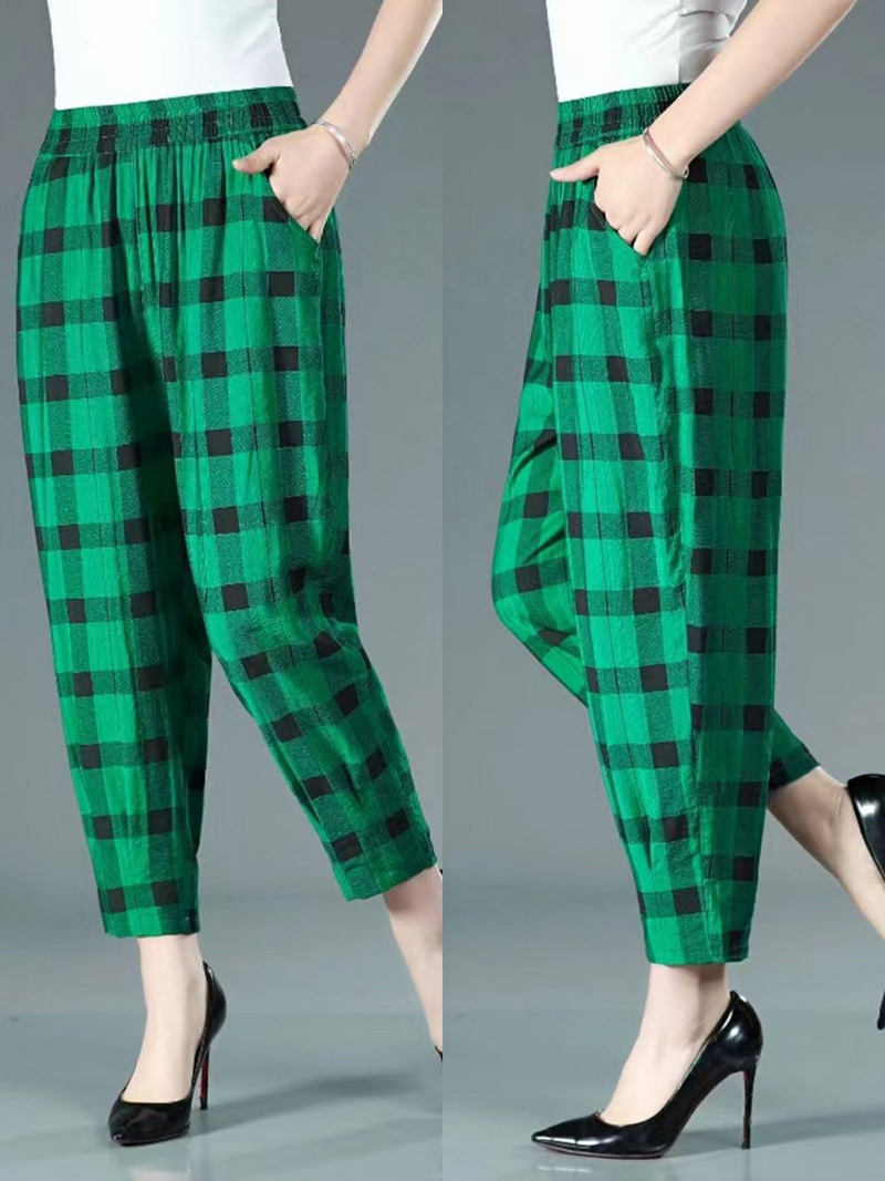 天丝棉麻裤女2022新款夏季薄款格子休闲裤中年妈妈宽松韩版九分裤