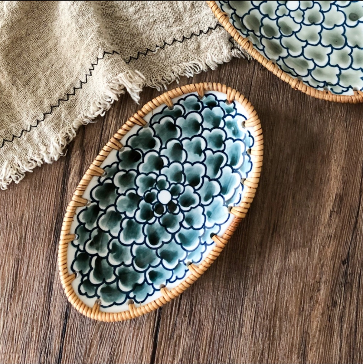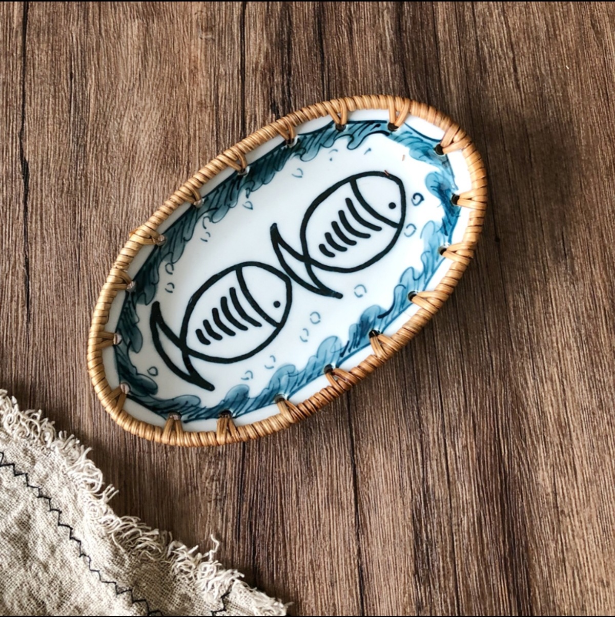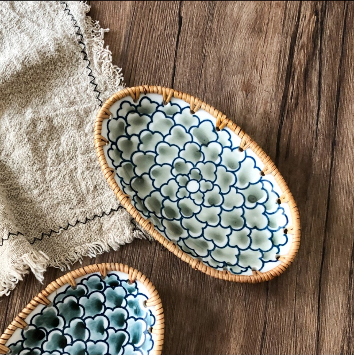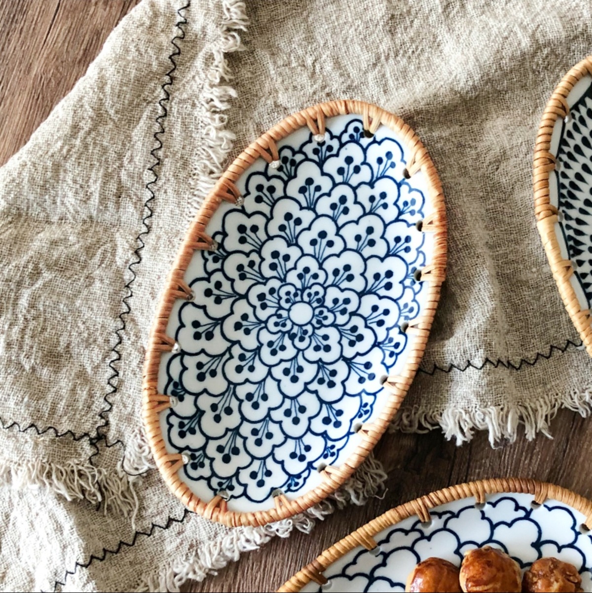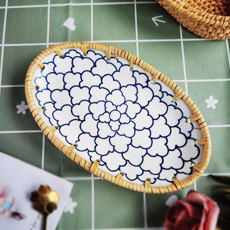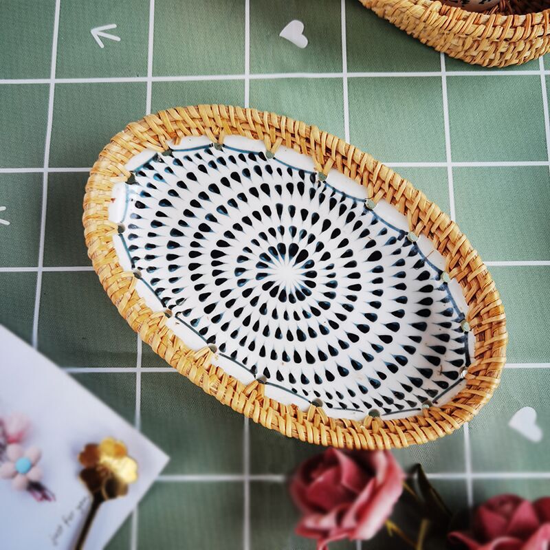 藤编陶瓷水果盘点心水果篮手工收纳筐家用托盘创意编织百搭盘子