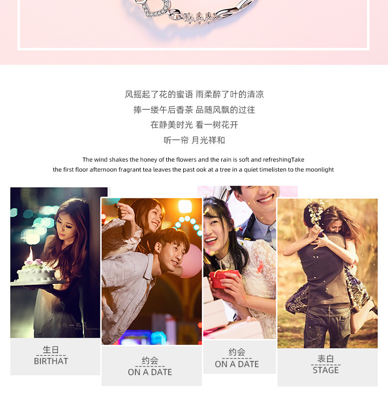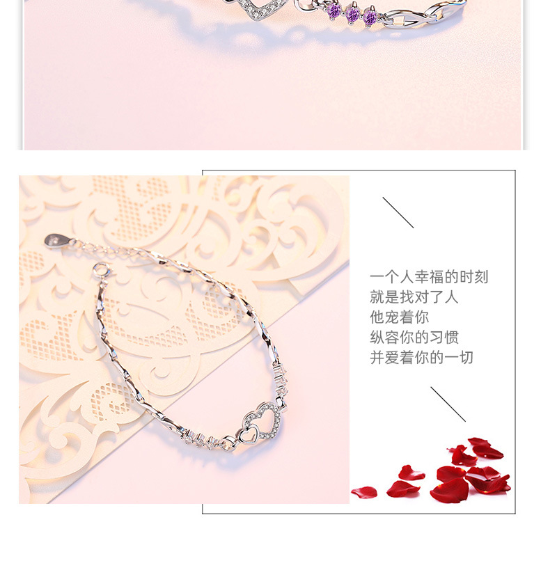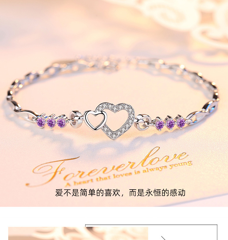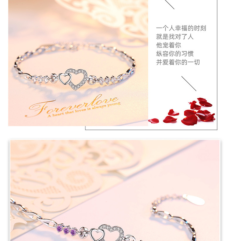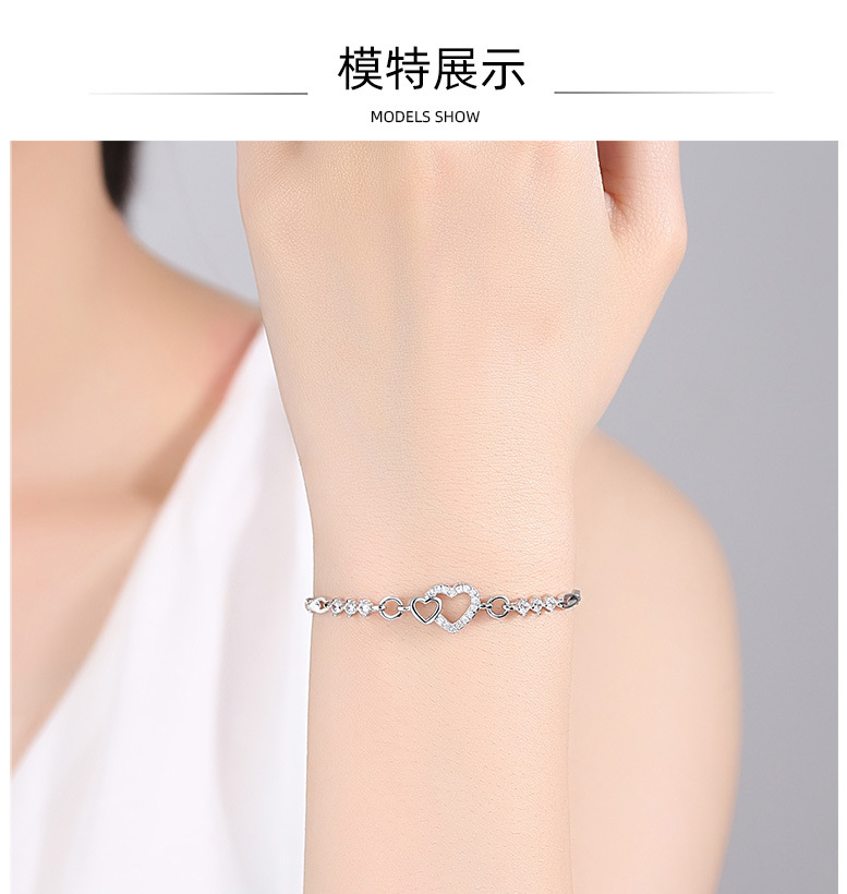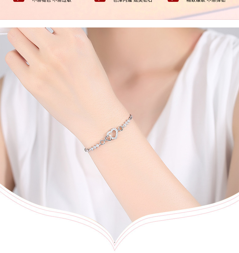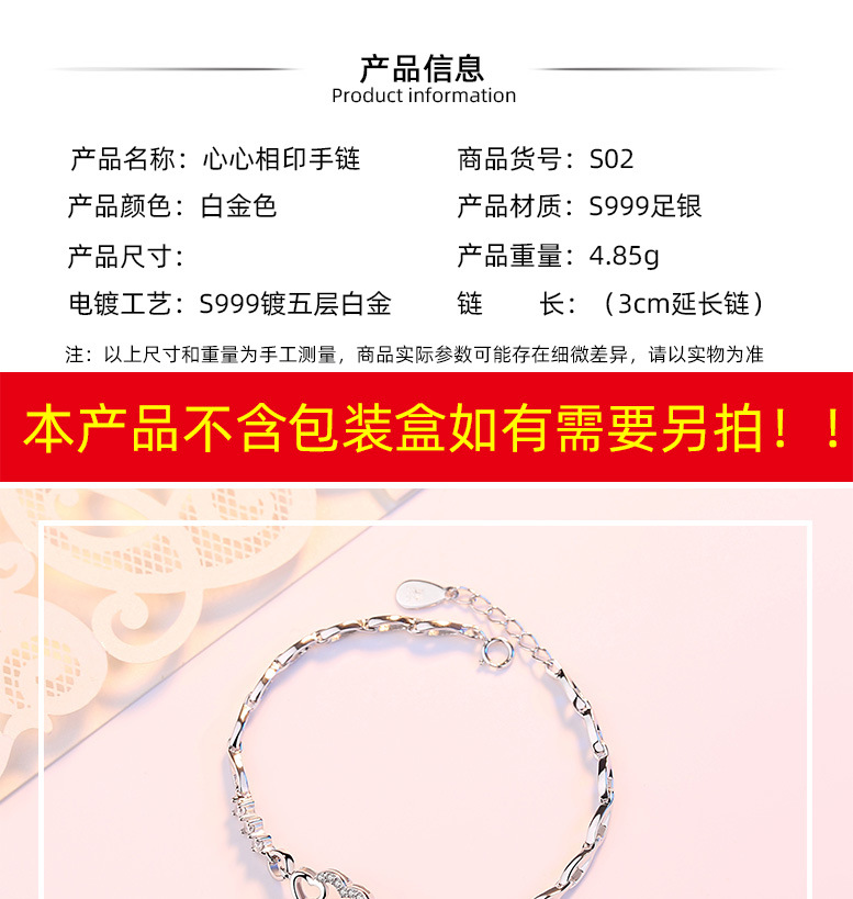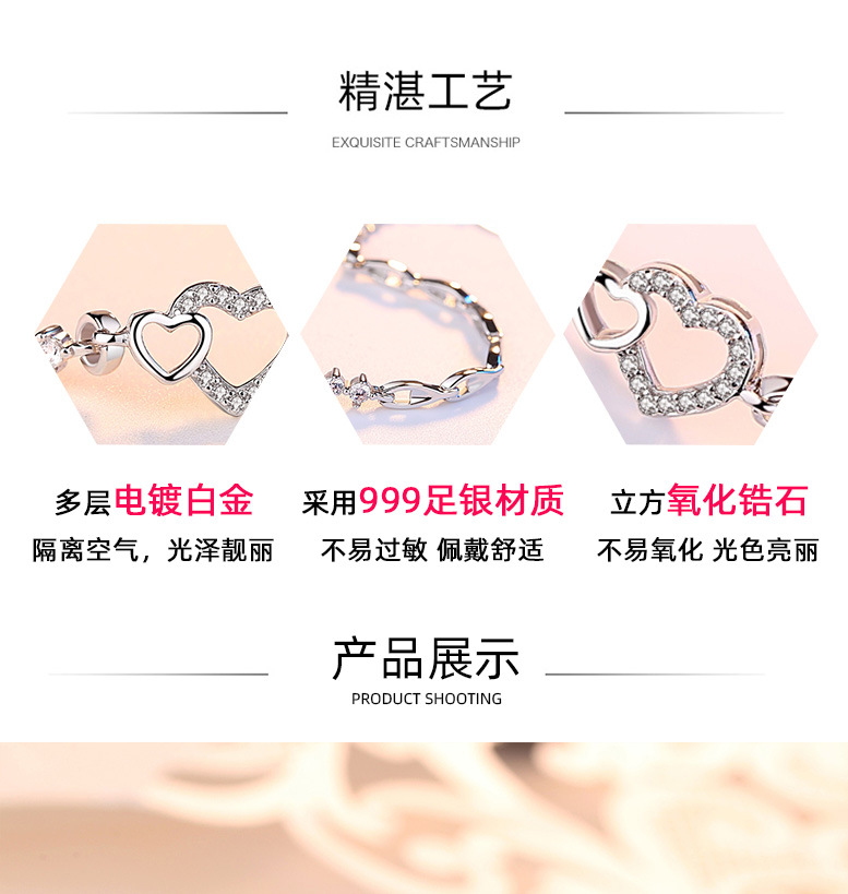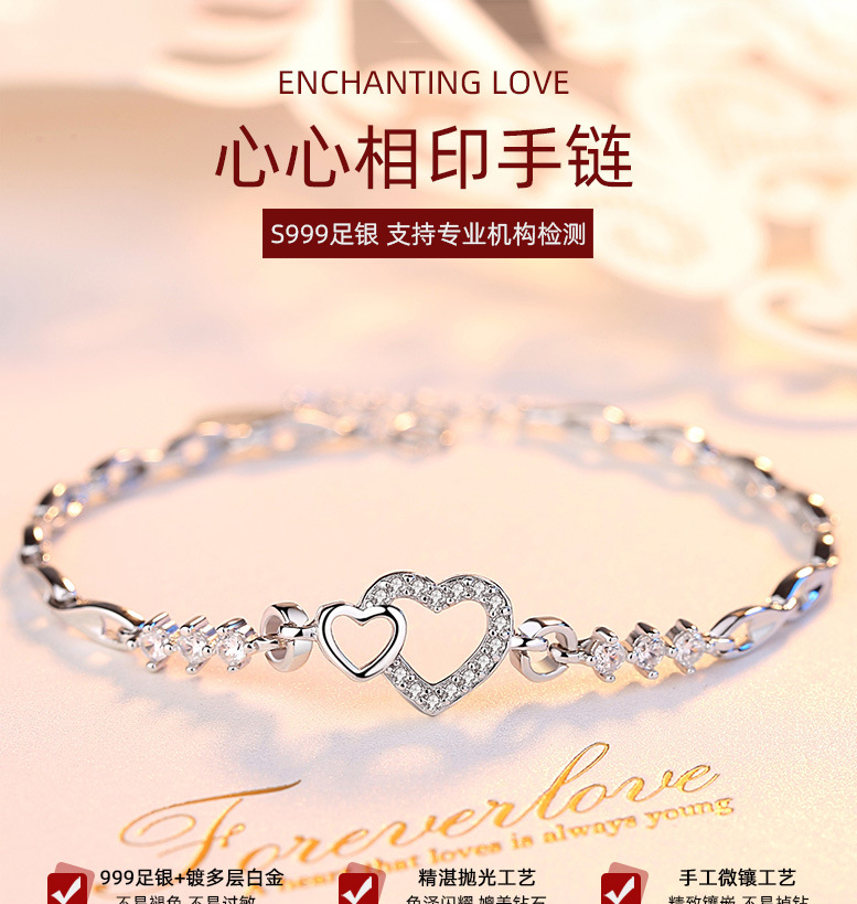 S999纯银爱心韩版心心相扣手饰日韩风心形手链满钻闪亮银饰网红风