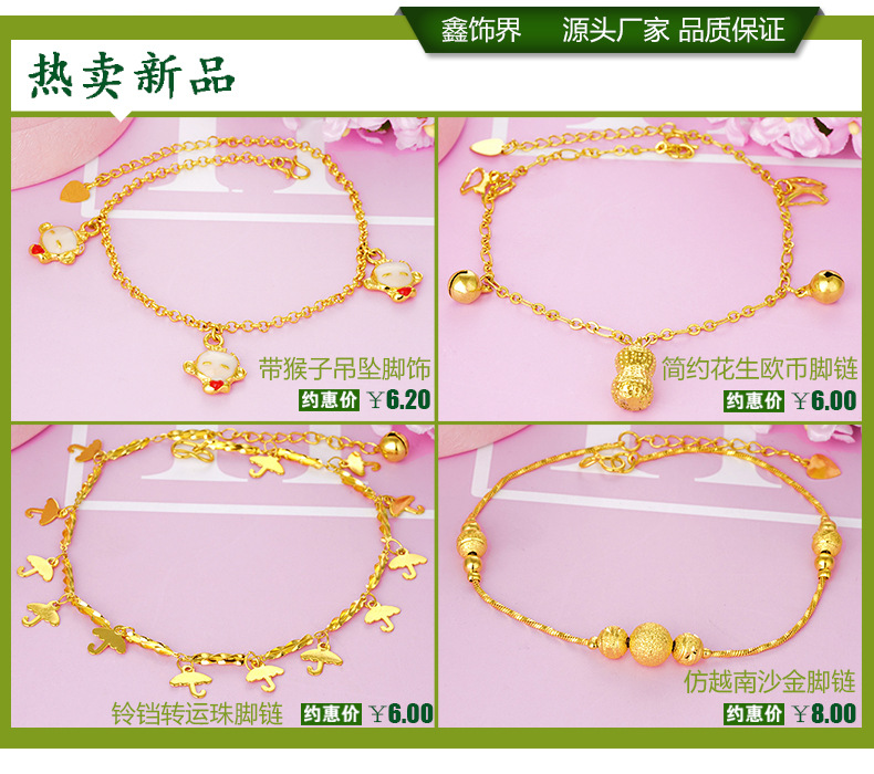 越南沙金时尚脚链 黄铜镀24k金铃铛双层转&运珠脚饰女外贸欧币金