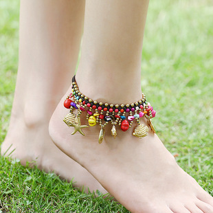 欧美波西米亚风结满诚饰品跨境沙滩铃铛海星铜配件手工编织脚链女