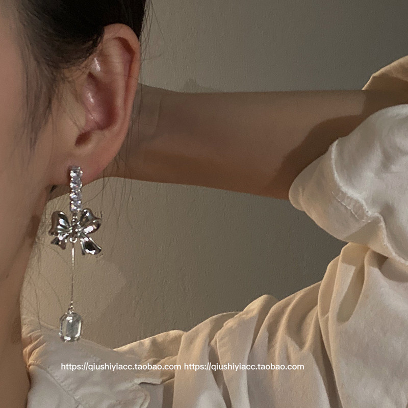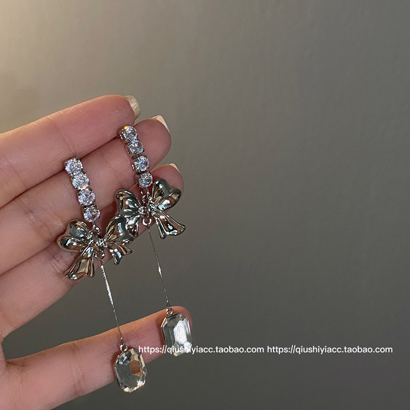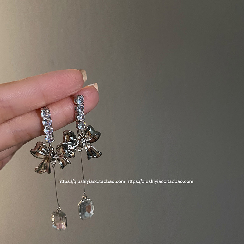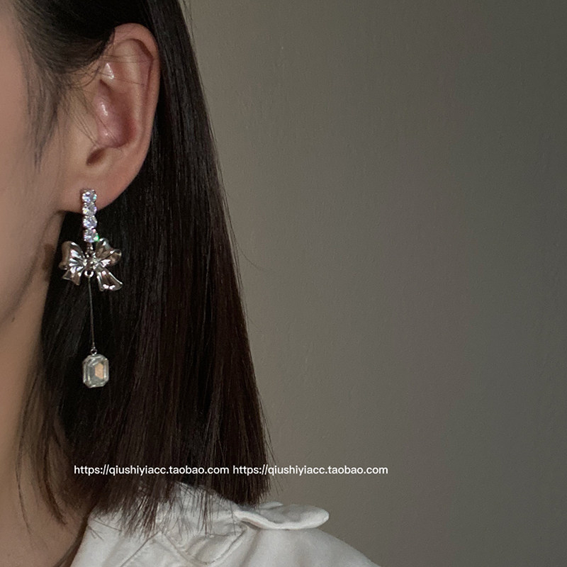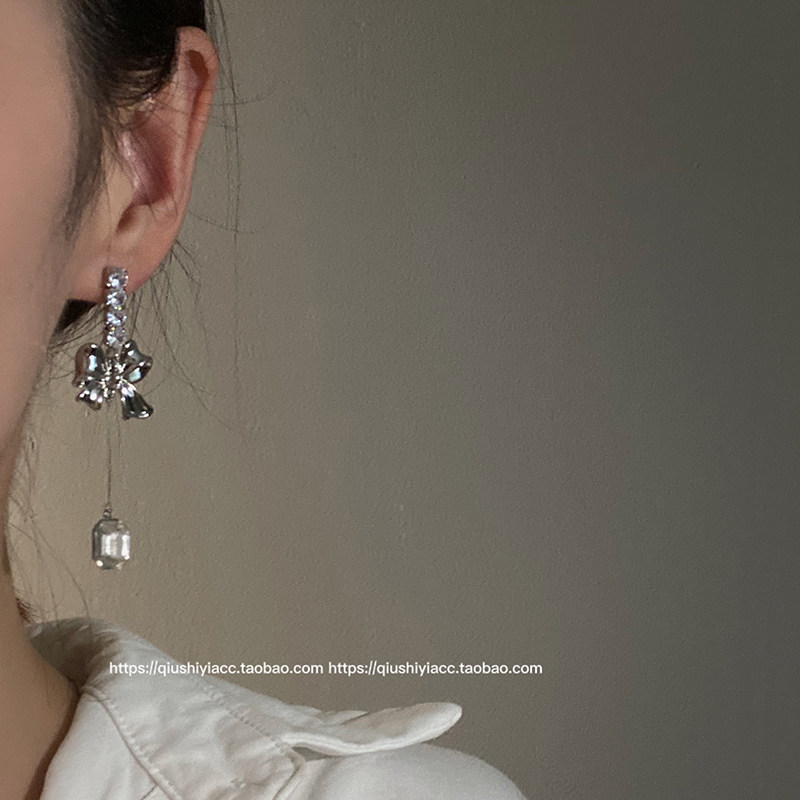 S925银针锆石蝴蝶结耳环时尚气质简约小众金属风耳坠个性新款