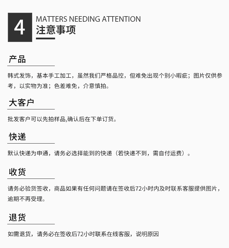 本厂专业生产批发流行饰品,产品为仿韩饰品,批量生产,基本上手工加工,不同批次产品可能会有差异,小瑕疵无法避免,大家都应该明白一分钱一分货的道理,不要凭自己的想像,每个人的想像都是无限大,这个我们满足不了,请见谅!对于质量非常苛刻的客户,请到专柜购买!