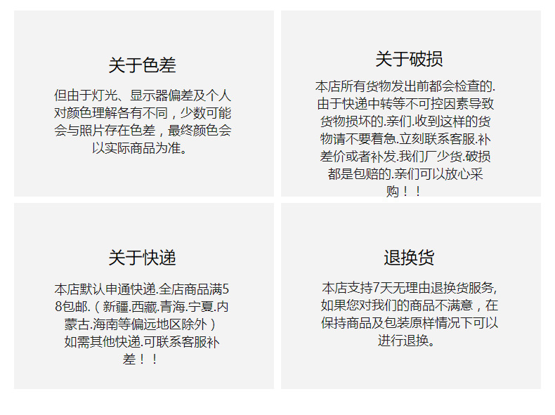 | 我们给您承诺 让您买的放心!! *.收到货不满意怎么办? 我们给您承诺7天无理由退货!! *.收到有损坏怎么办? 亲亲 我们货物发出前都会检查 因为快递中转等不可控因素可能导致货物损坏 第一时间拍照联系客服 我们承诺包退!! *.收到少货怎么办? 亲亲 仓库打包的都是一群小哥哥 比较粗心可能会漏发 一定要第一时间拍照联系客服赔偿!! *。收到货有质量问题怎么办? 亲亲 非常抱歉可能仓库没有检查仔细 请您第一时间联系客服处理 我们会给您一个满意的答复!! |