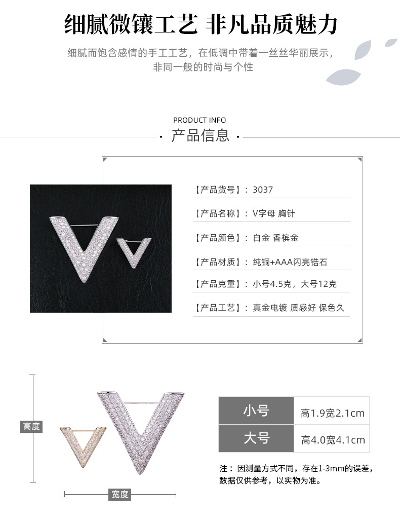 字母V型锆石胸针高级感电镀真金胸花高档装饰防走光西服领针