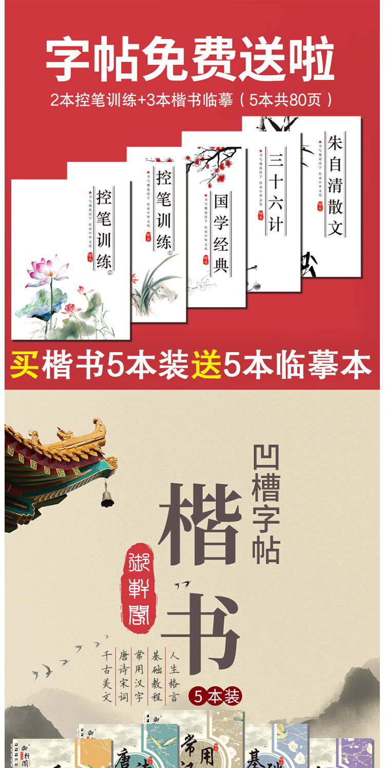 | free 10 refills, 1 pen case, 1 pencil grip: 5 regular script +2 control pen +3 copy [10 copies in total]](赠10支笔芯1个笔壳1个握笔器:楷书5本+2控笔+3临摹【共10本】) | USD $3.75 | 1000 piece available |