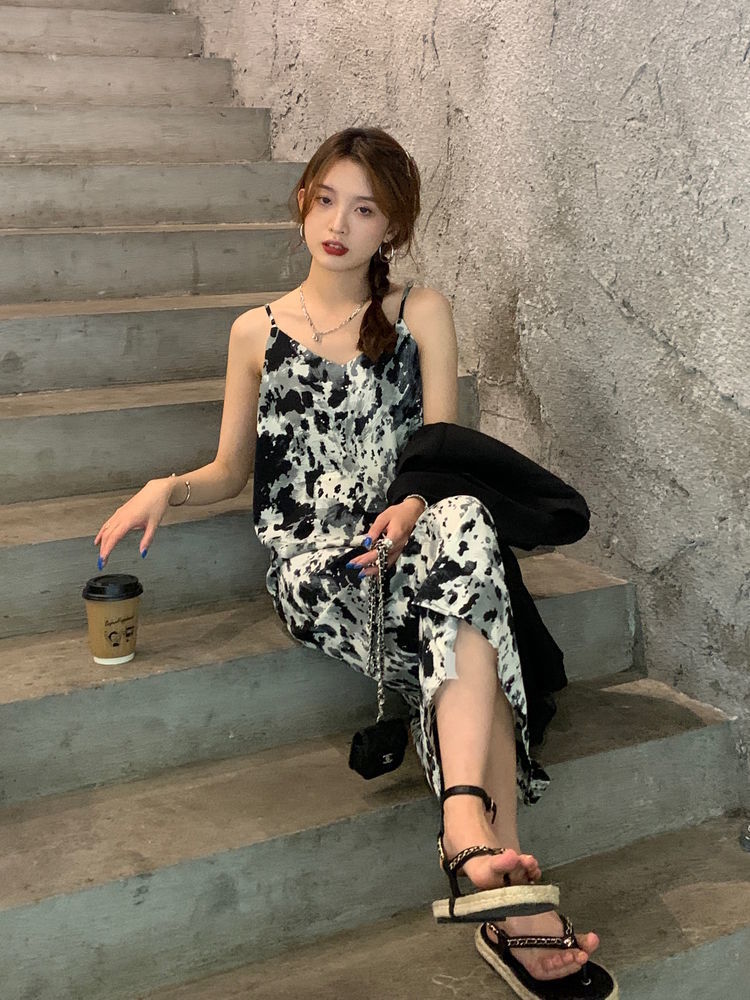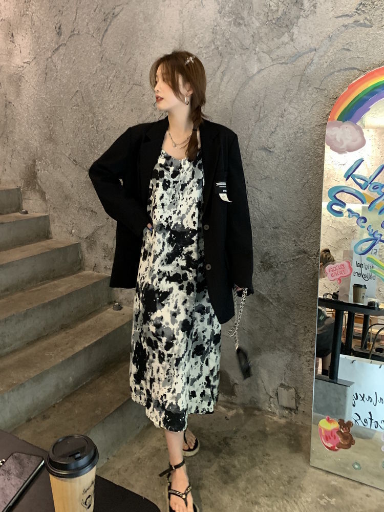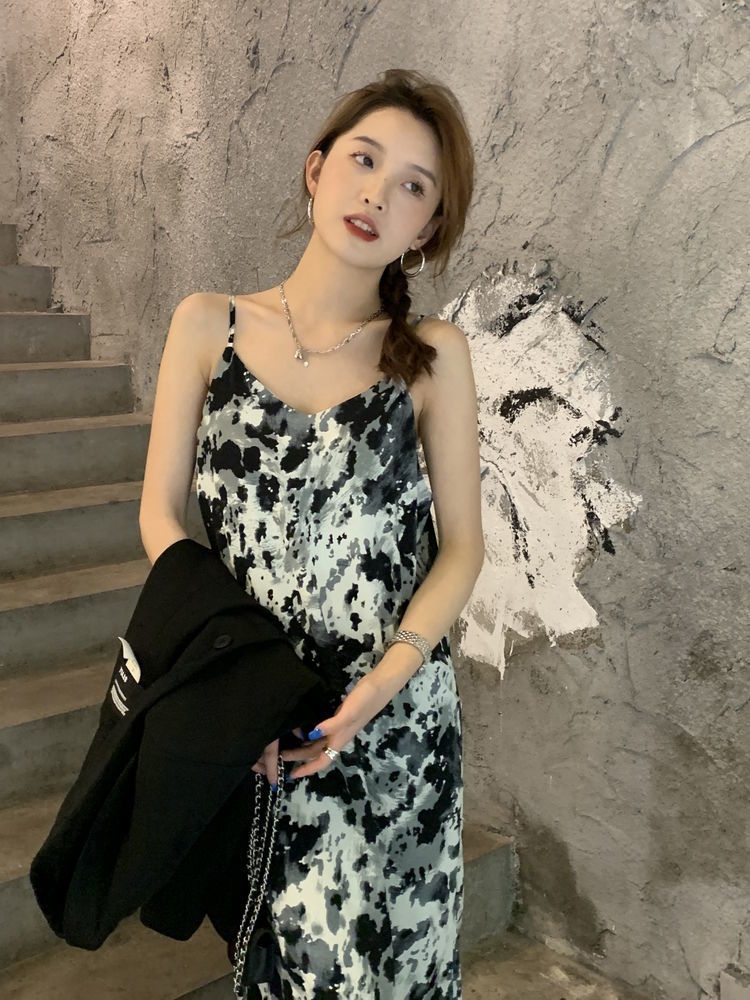 2022年春夏季扎染碎花潮宽松吊带裙雪纺短袖女大码孕妇长款遮肚女
