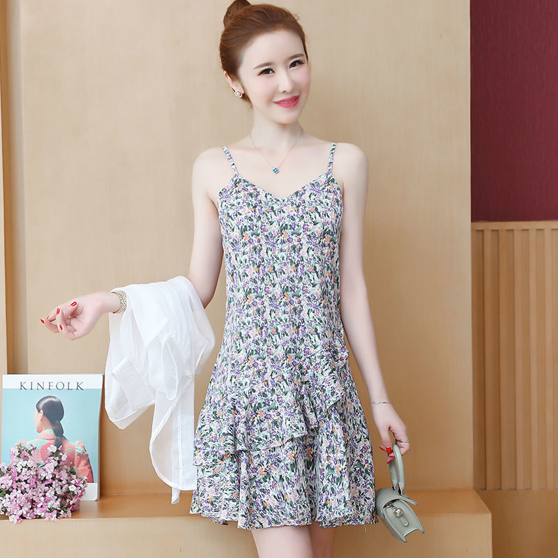 2021夏季新款韩版显瘦气质小个子短款小雏菊吊带裙碎花雪纺连衣裙