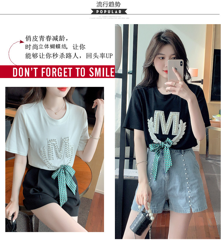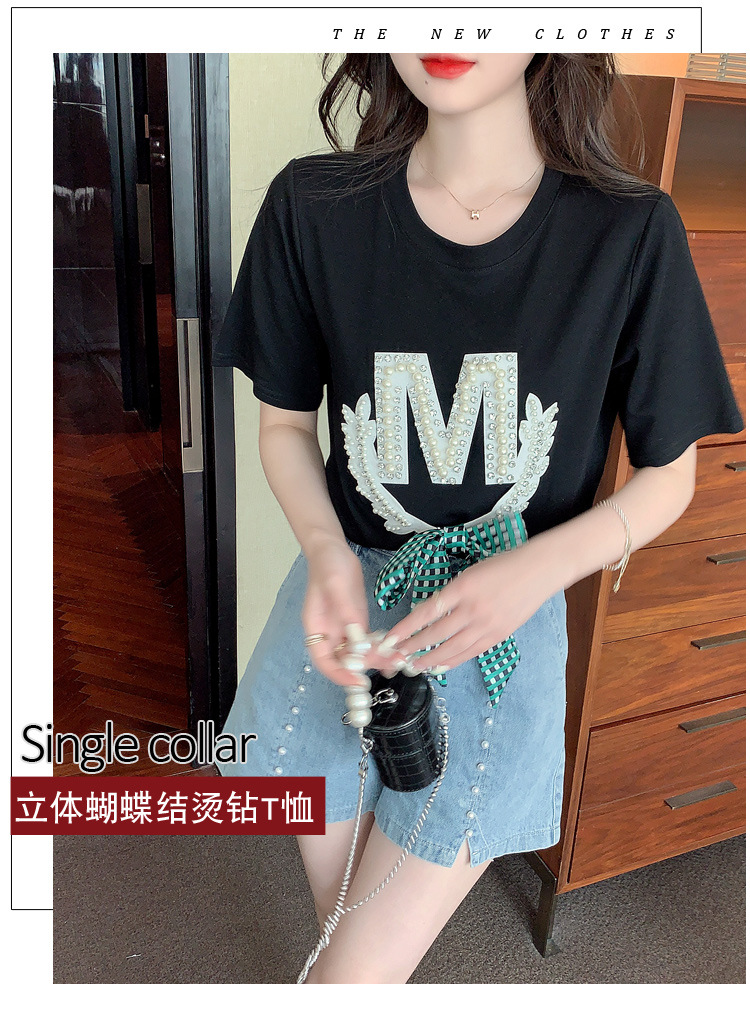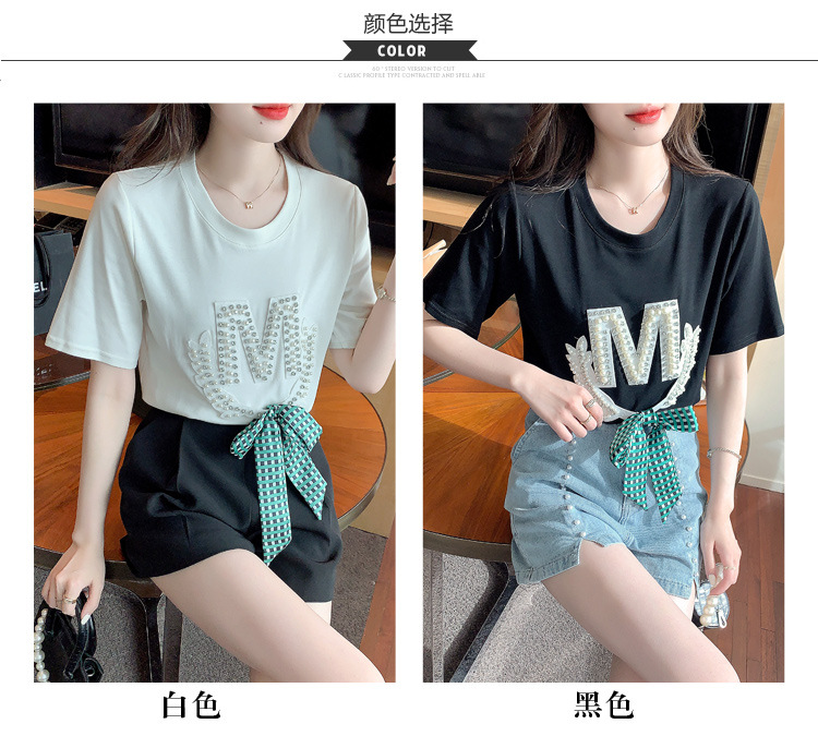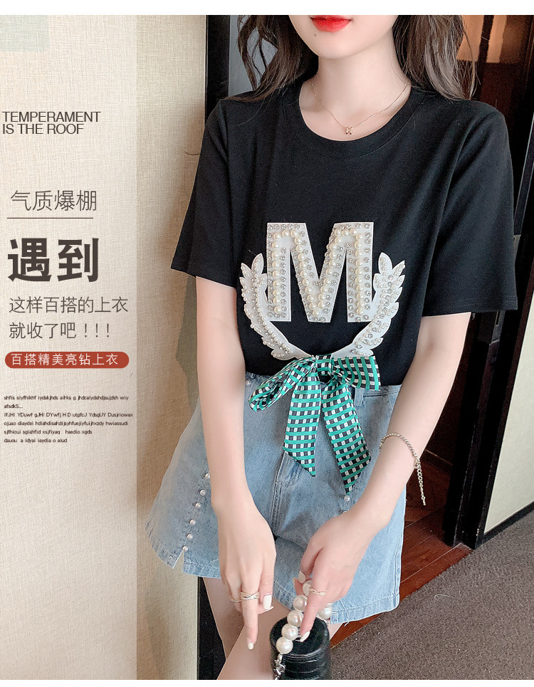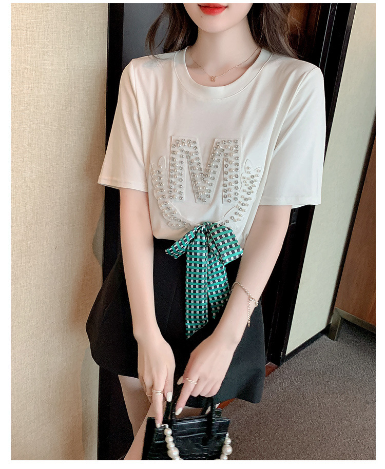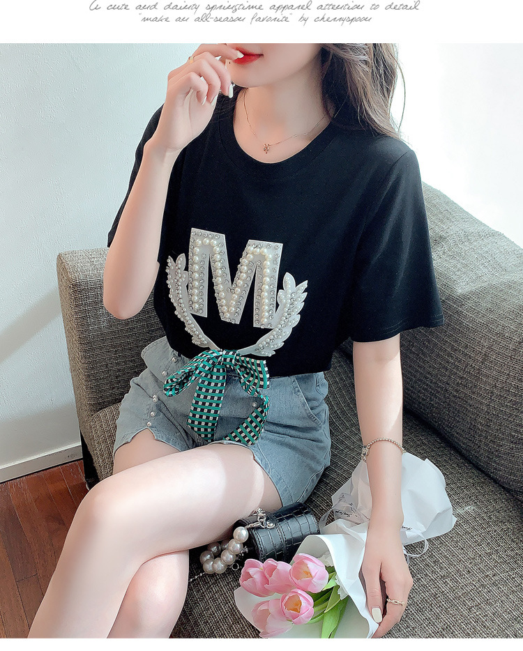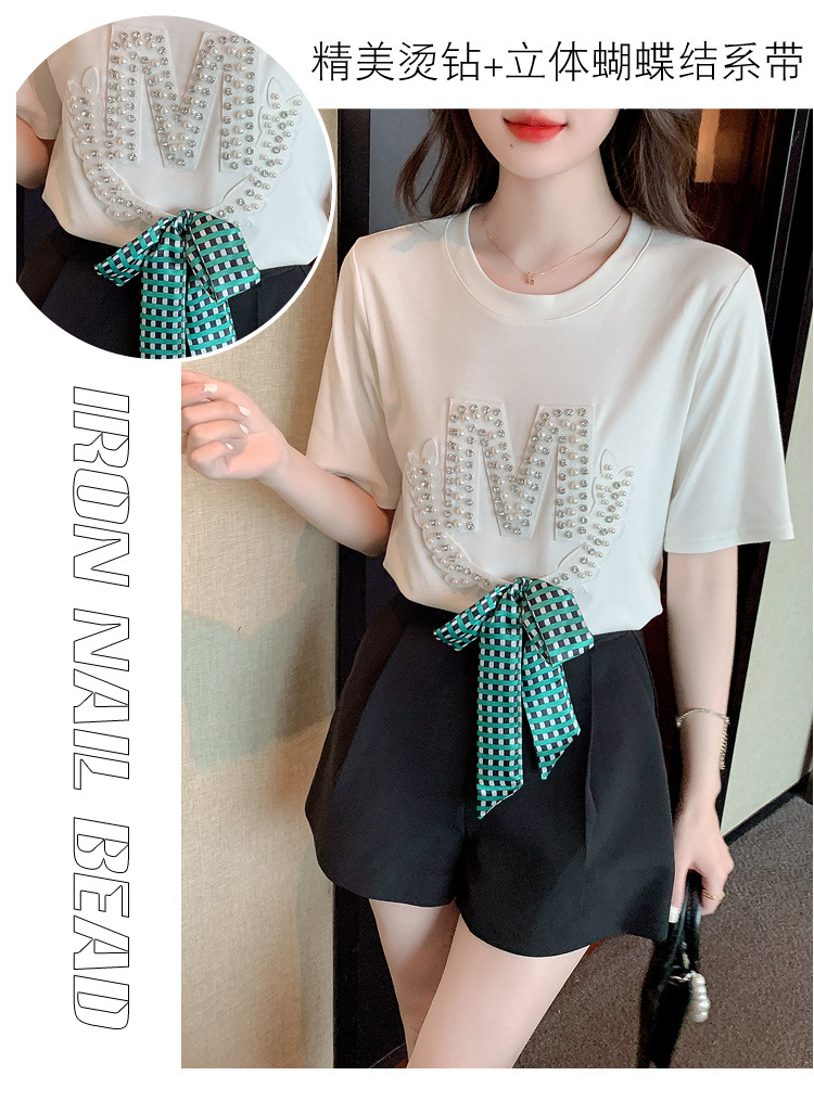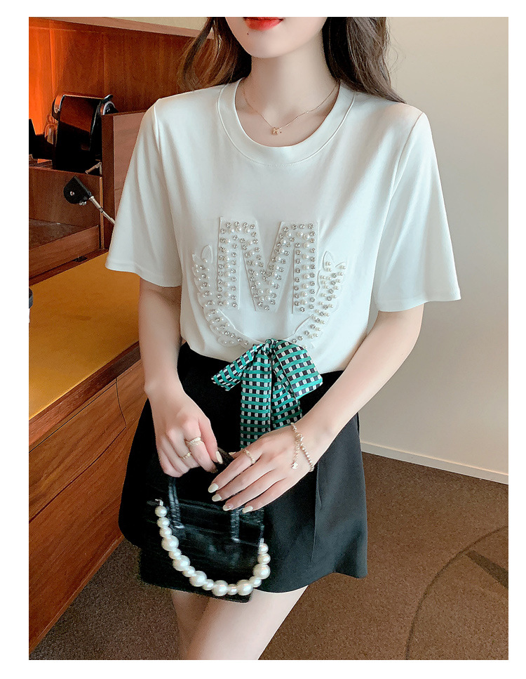 字母镶钻飘带蝴蝶结T恤女2022春夏新款麦穗重工串珠短袖上衣体恤
