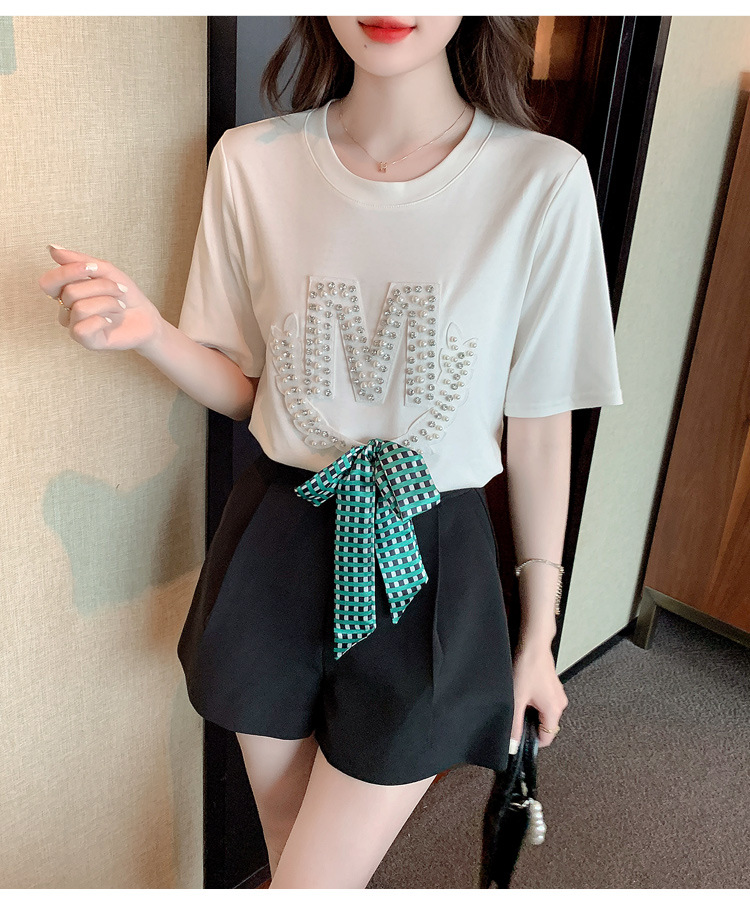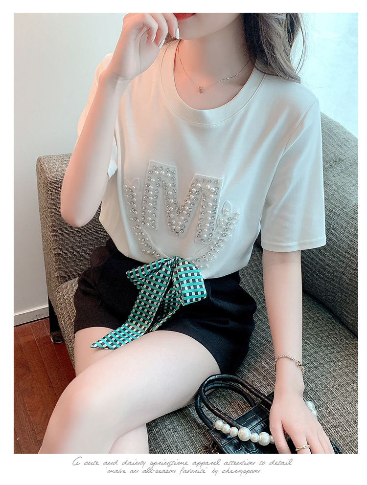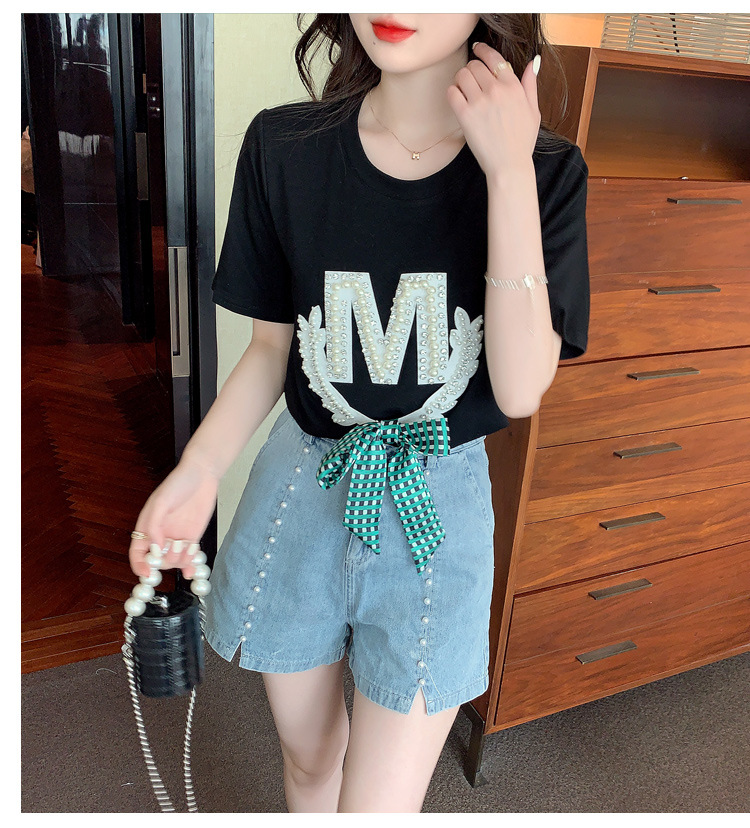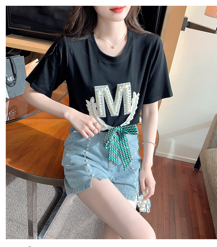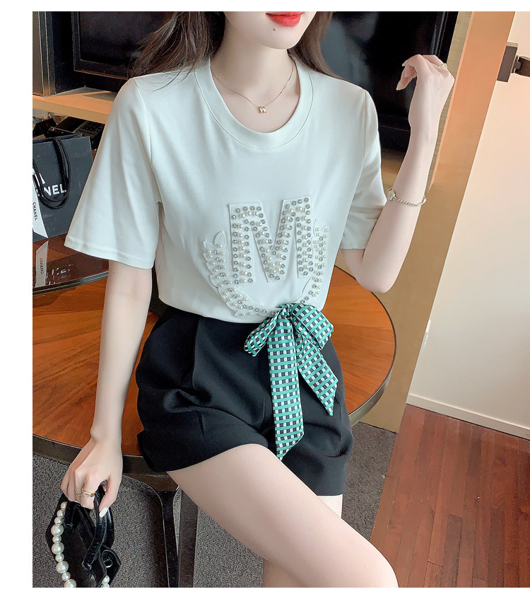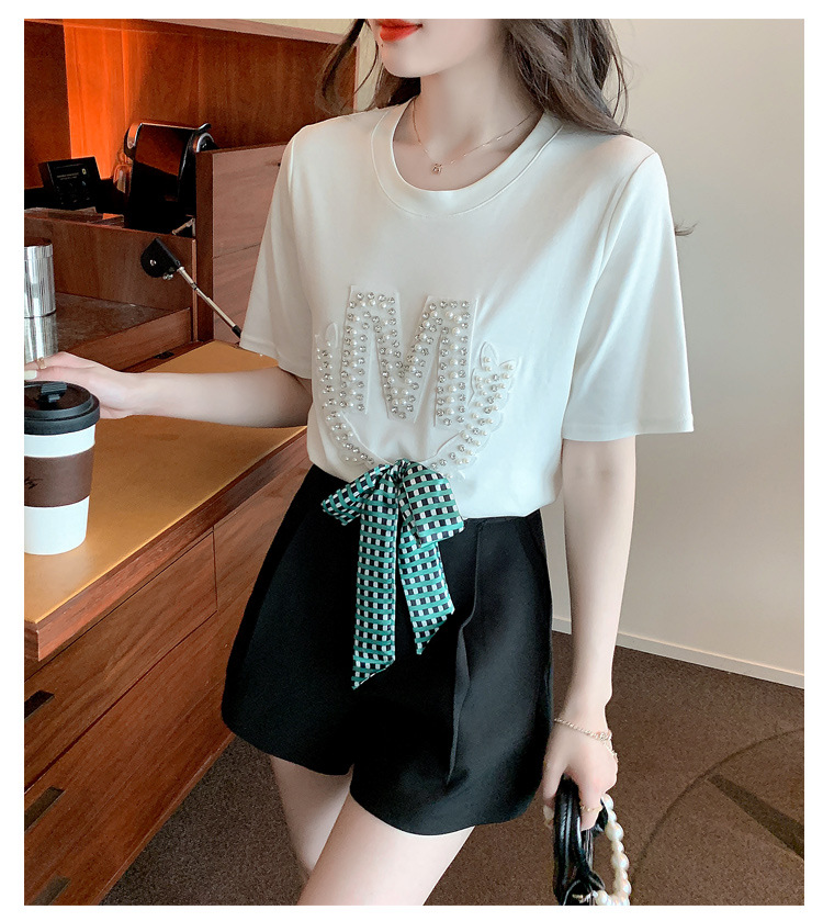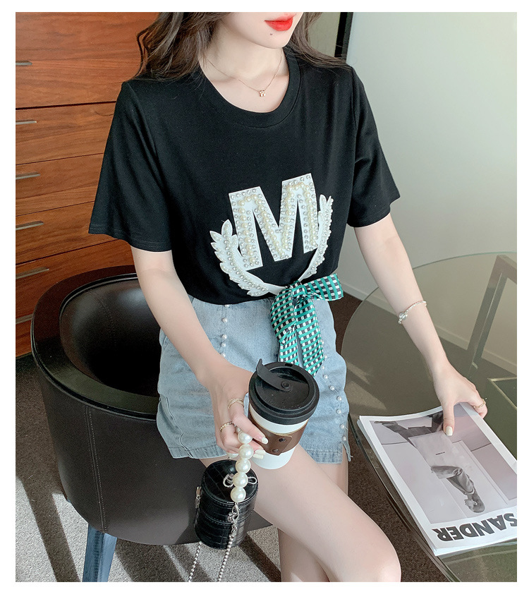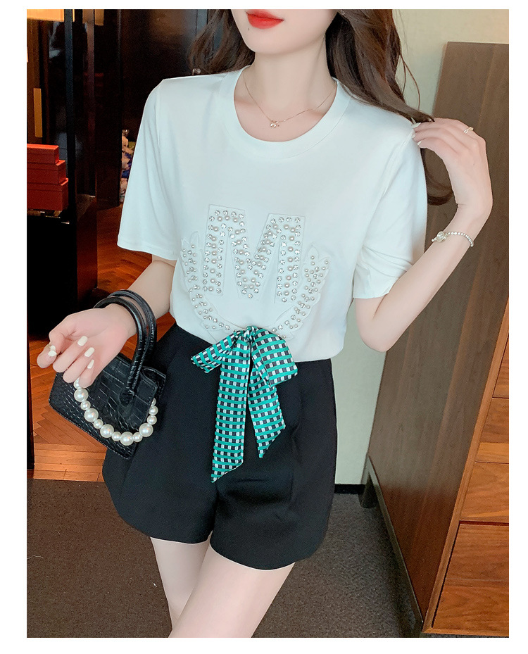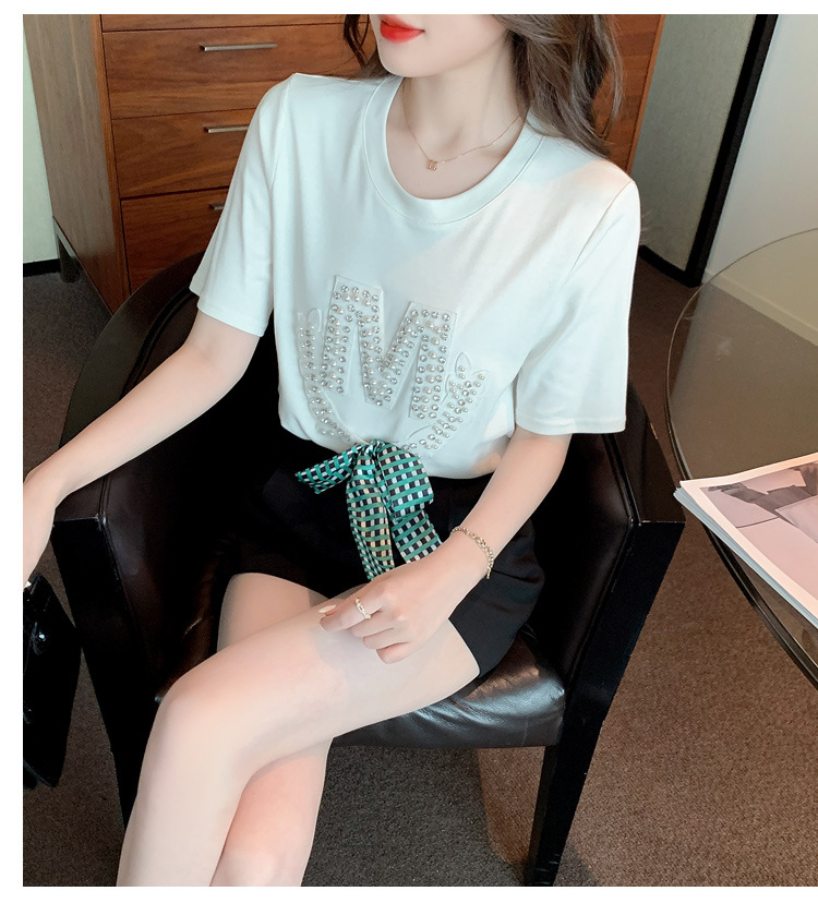字母镶钻飘带蝴蝶结T恤女2022春夏新款麦穗重工串珠短袖上衣体恤