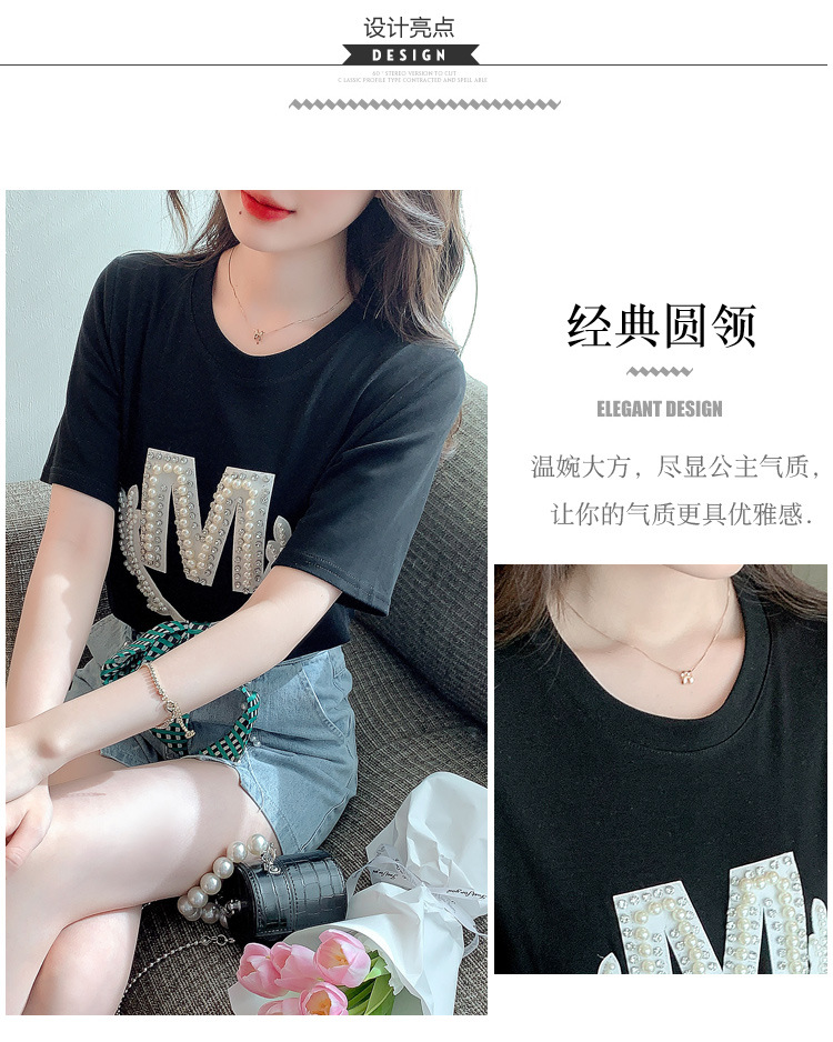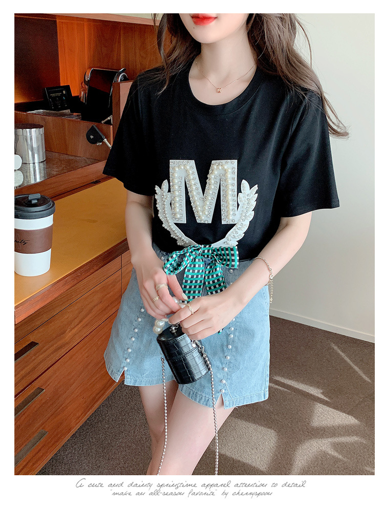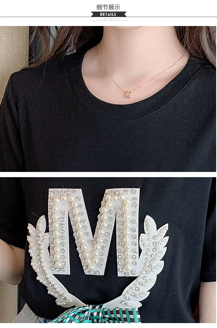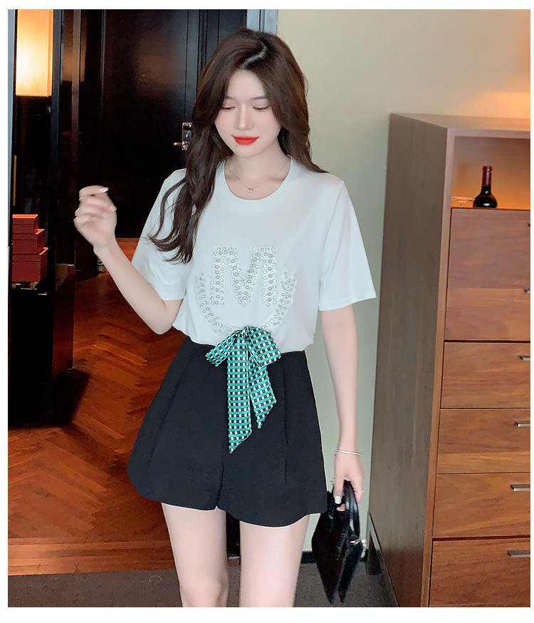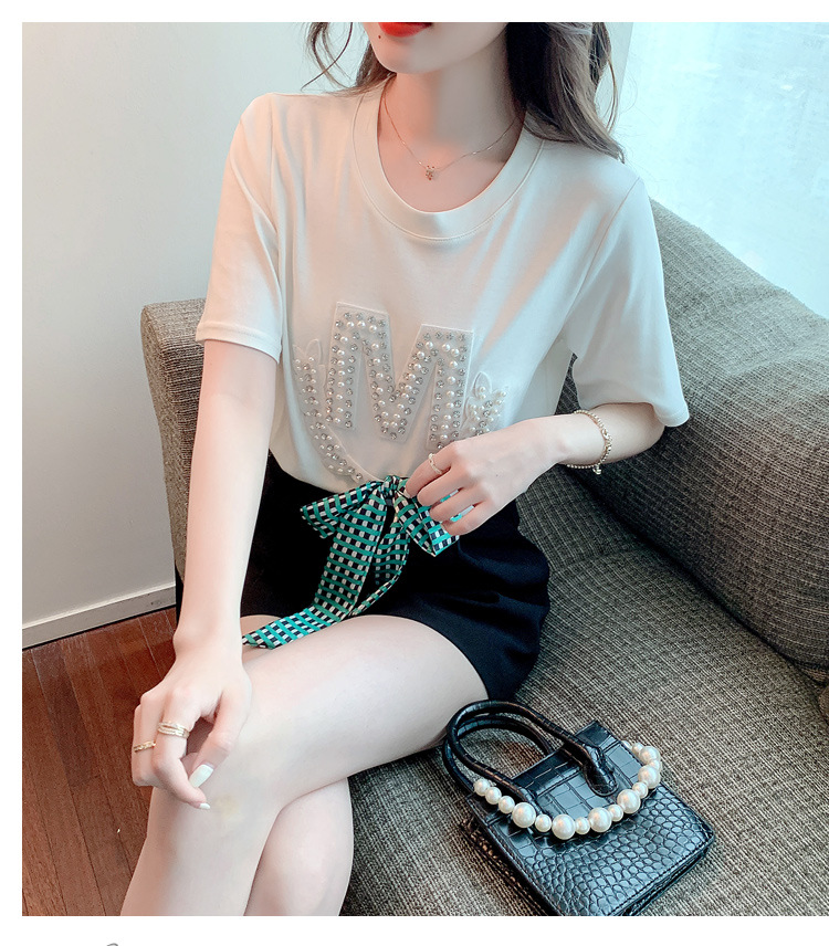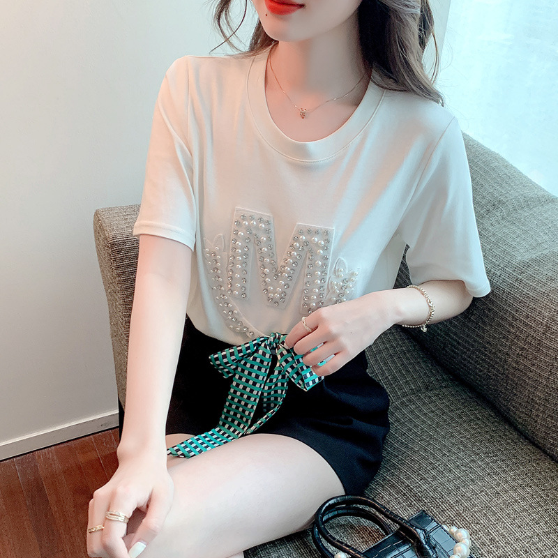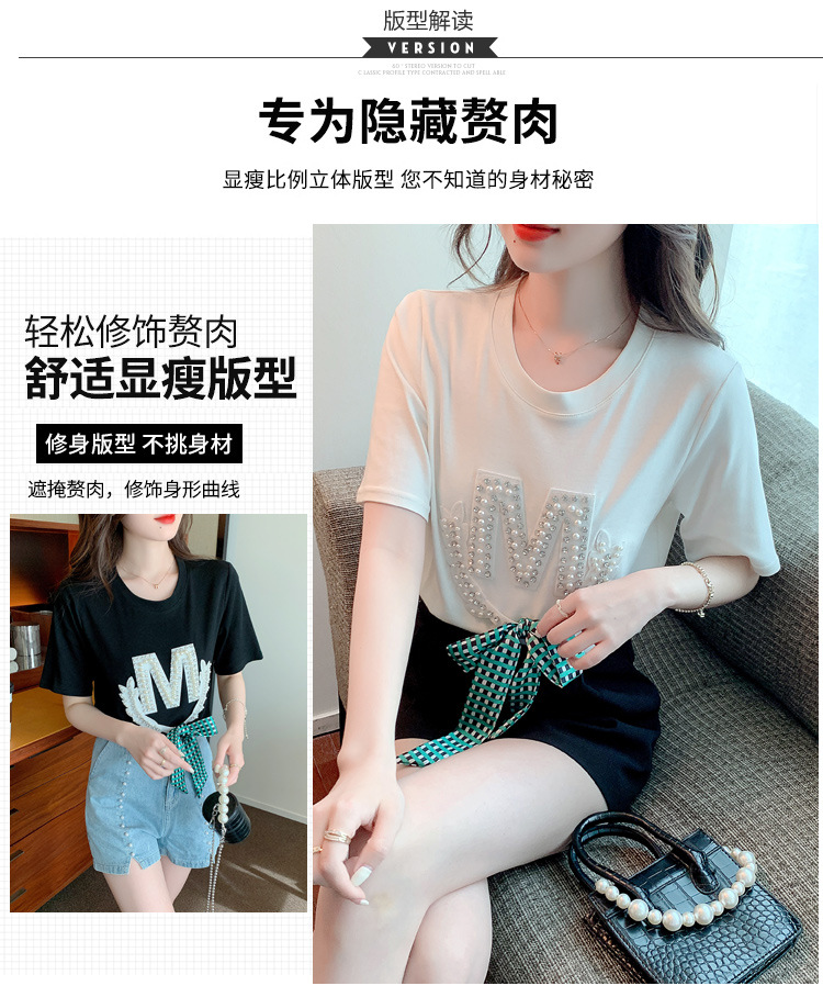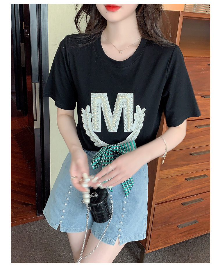 字母镶钻飘带蝴蝶结T恤女2022春夏新款麦穗重工串珠短袖上衣体恤