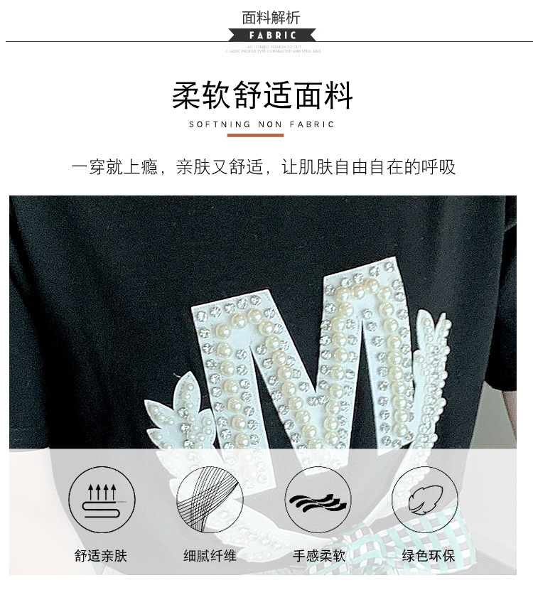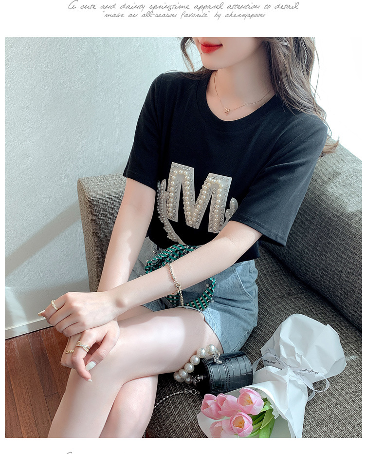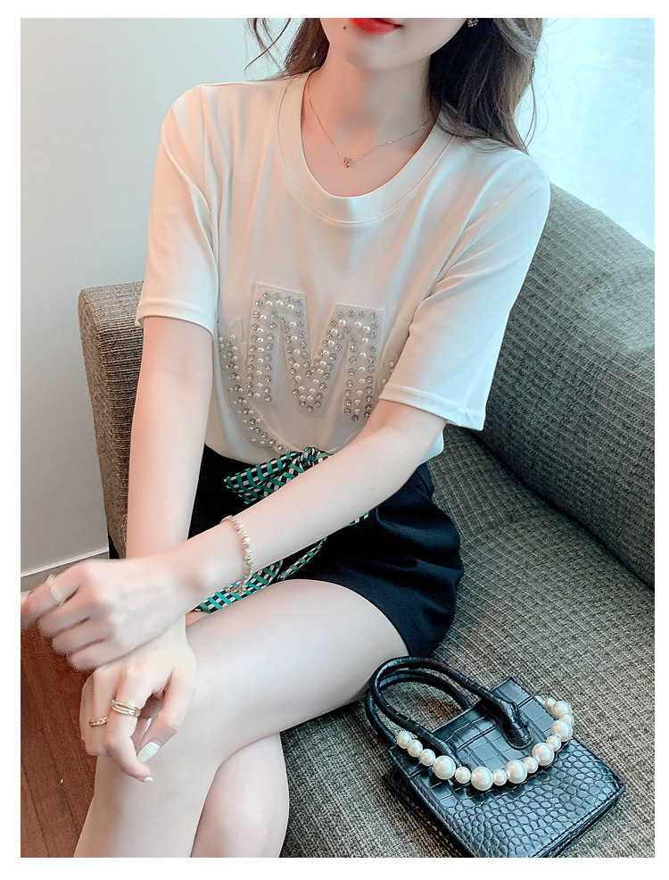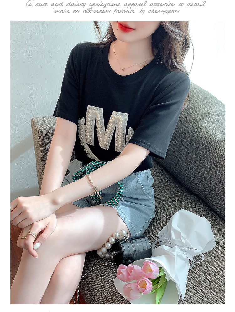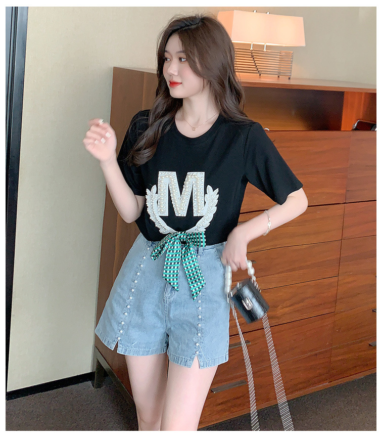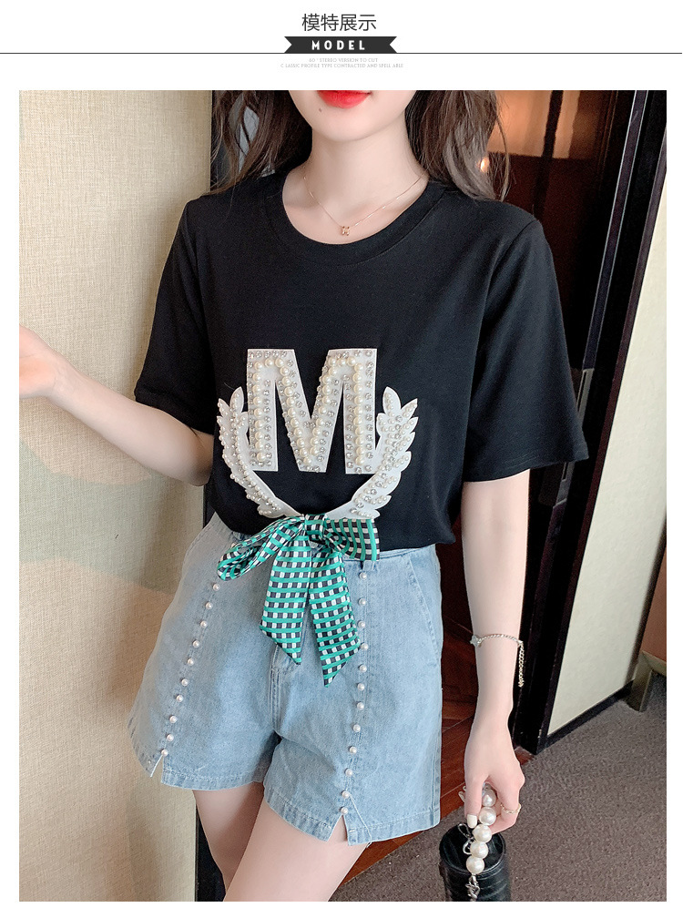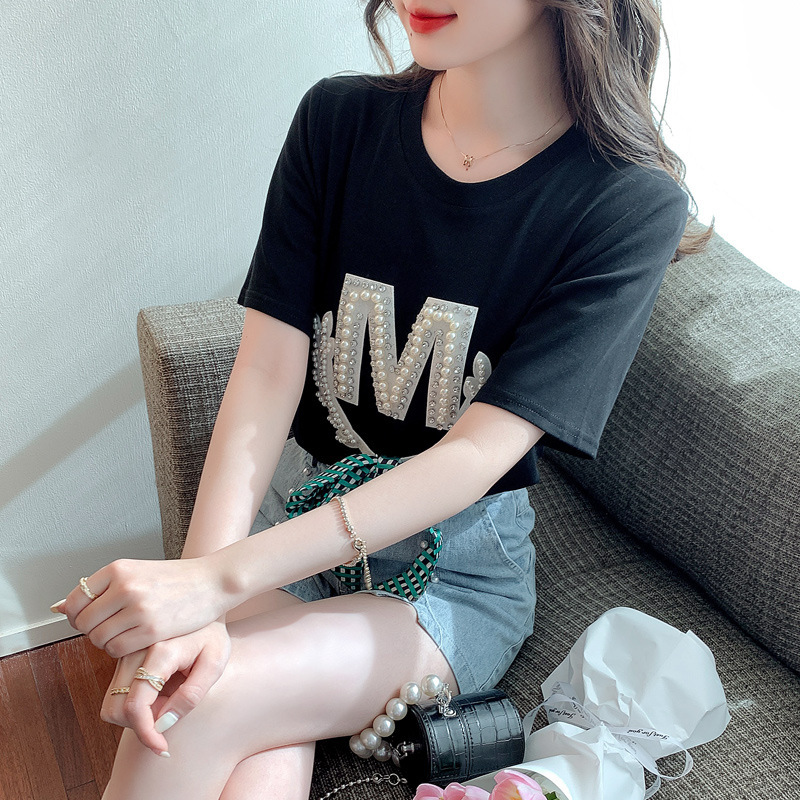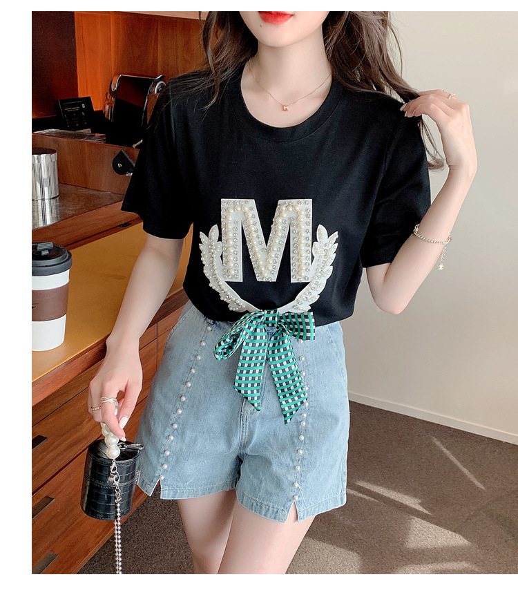 字母镶钻飘带蝴蝶结T恤女2022春夏新款麦穗重工串珠短袖上衣体恤
