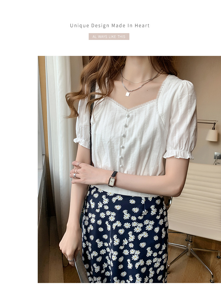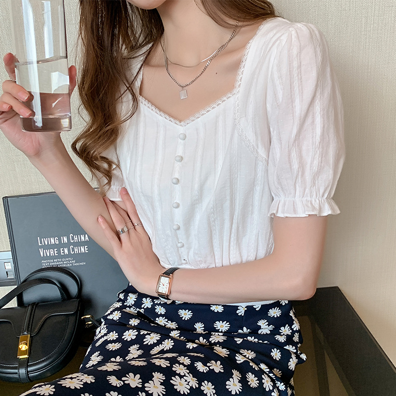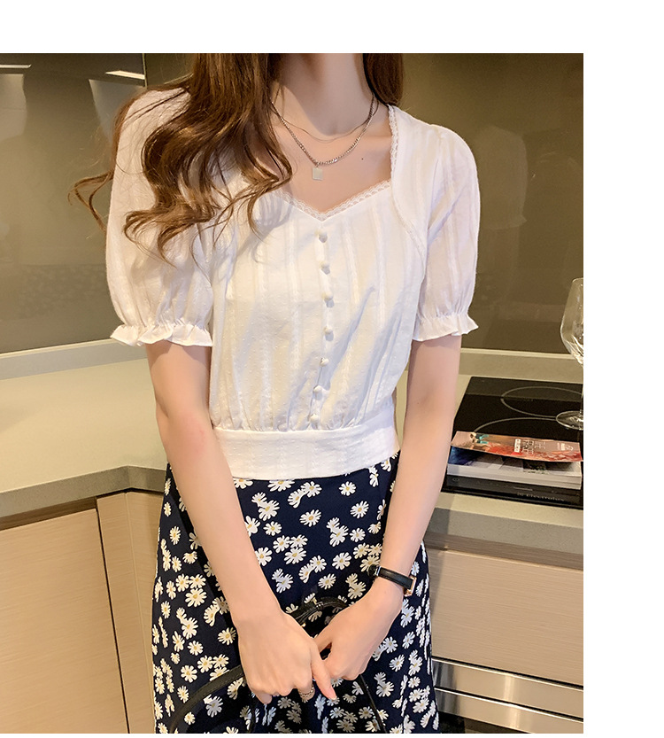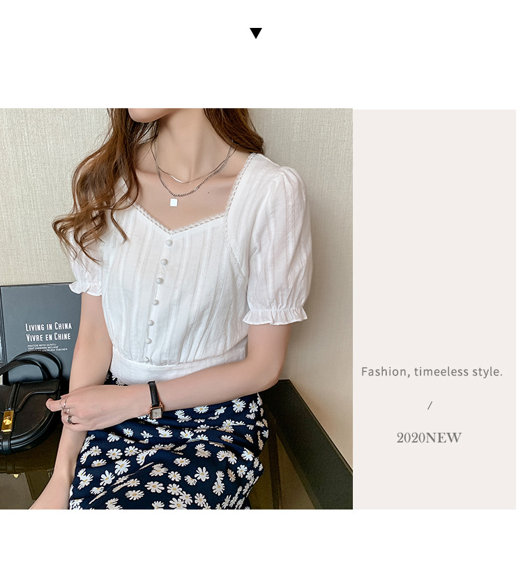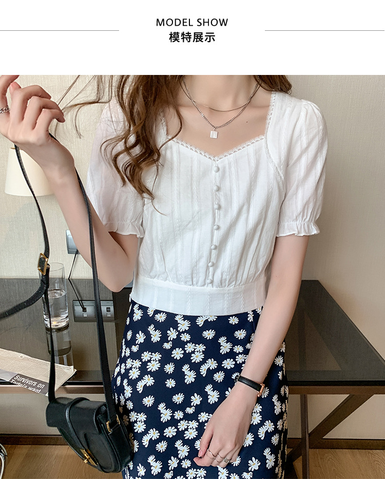 方领上衣女夏2022复古宫廷风泡泡袖短款雪纺衬衫设计感小众衬衣