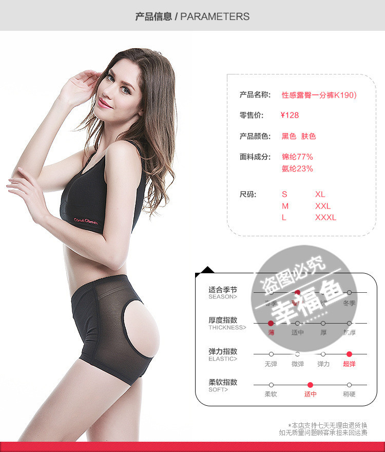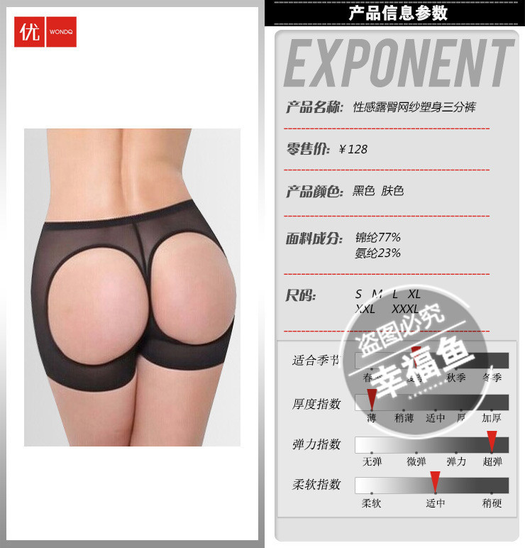 【功能阐述】整体无缝编织,弹性很大,塑身效果明显,丰臀翘臀,塑形紧肤