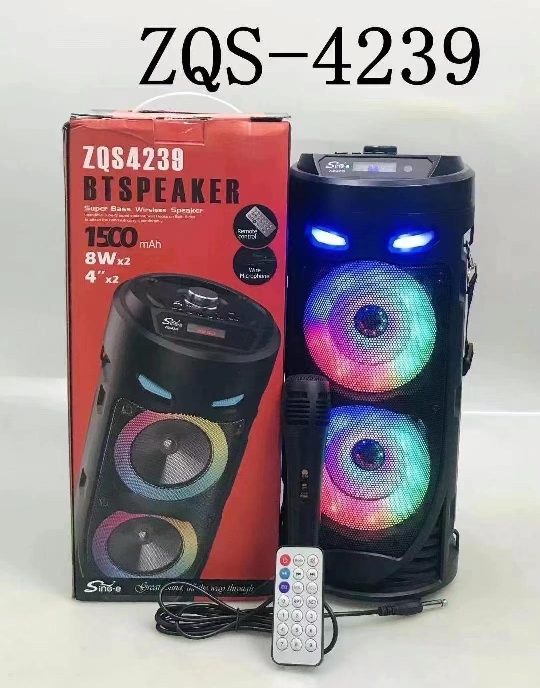 JS-4239 蓝牙音箱 ,带蓝牙/带收音/电位器音量+带USB/TF卡/MIC、DC-5V充电/带AUX(带3.5音频座)+双功放,假双声道/带锂电保护+带显示屏/USB、对箱功能+带幻彩灯+七彩灯.18650电池3.7V/1800MAH 喇叭 双4寸功率:8W*2,请联系18857917188,请安排!