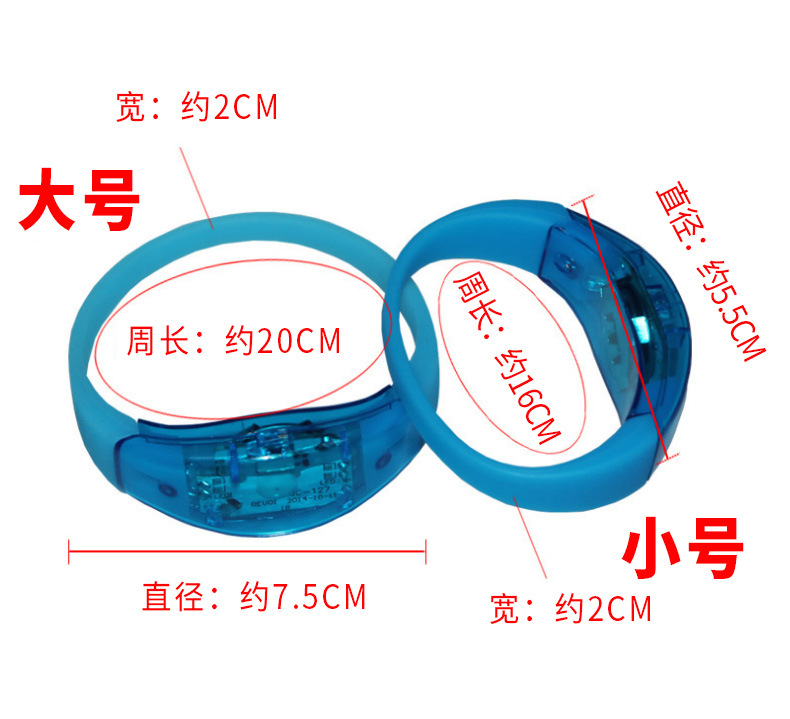 功能:声控款:可根据声音控制手环发光、声音分贝高 ,LED的亮度就会 亮。