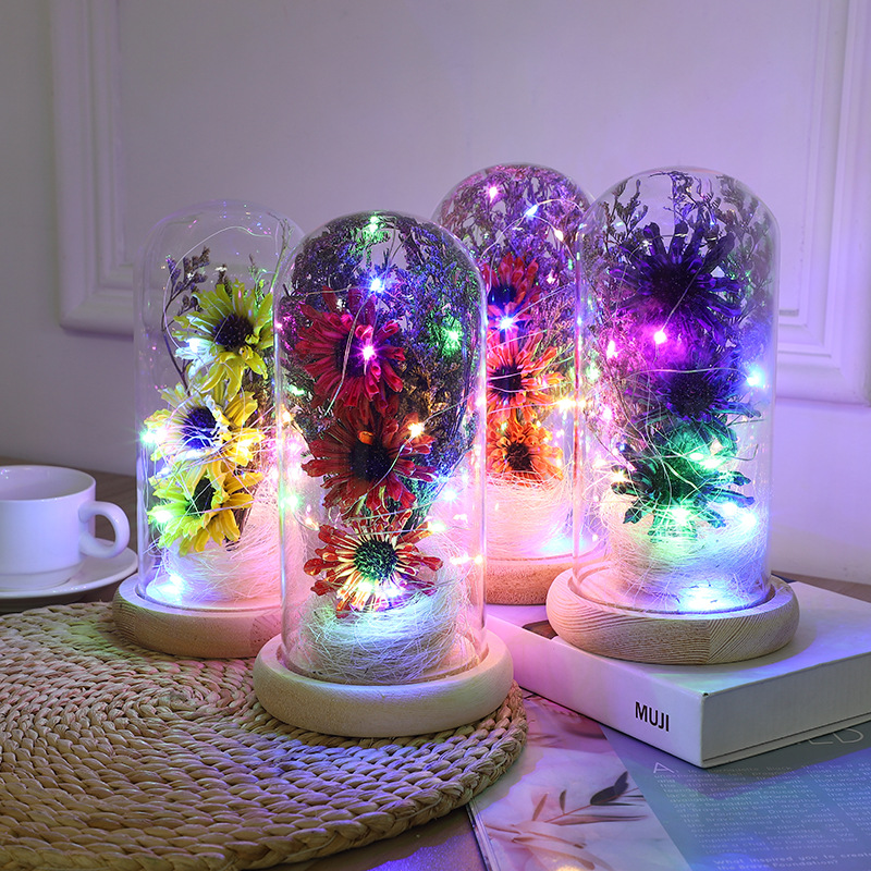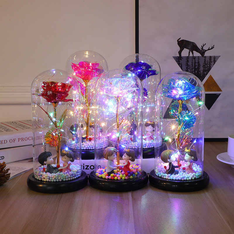 玻璃罩永生玫瑰花摆件 LED发光仿真花创意圣诞情人节礼物现货批发