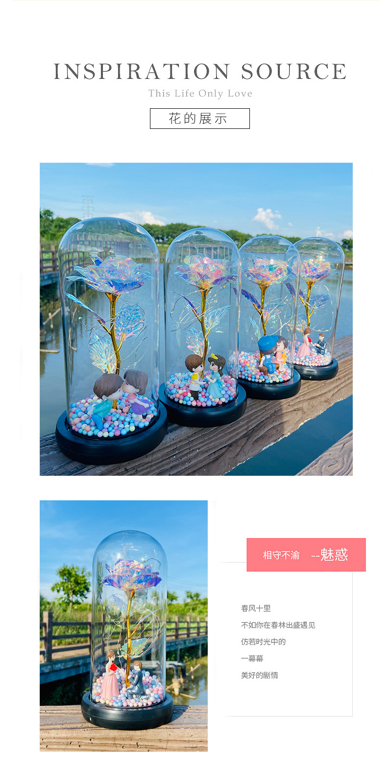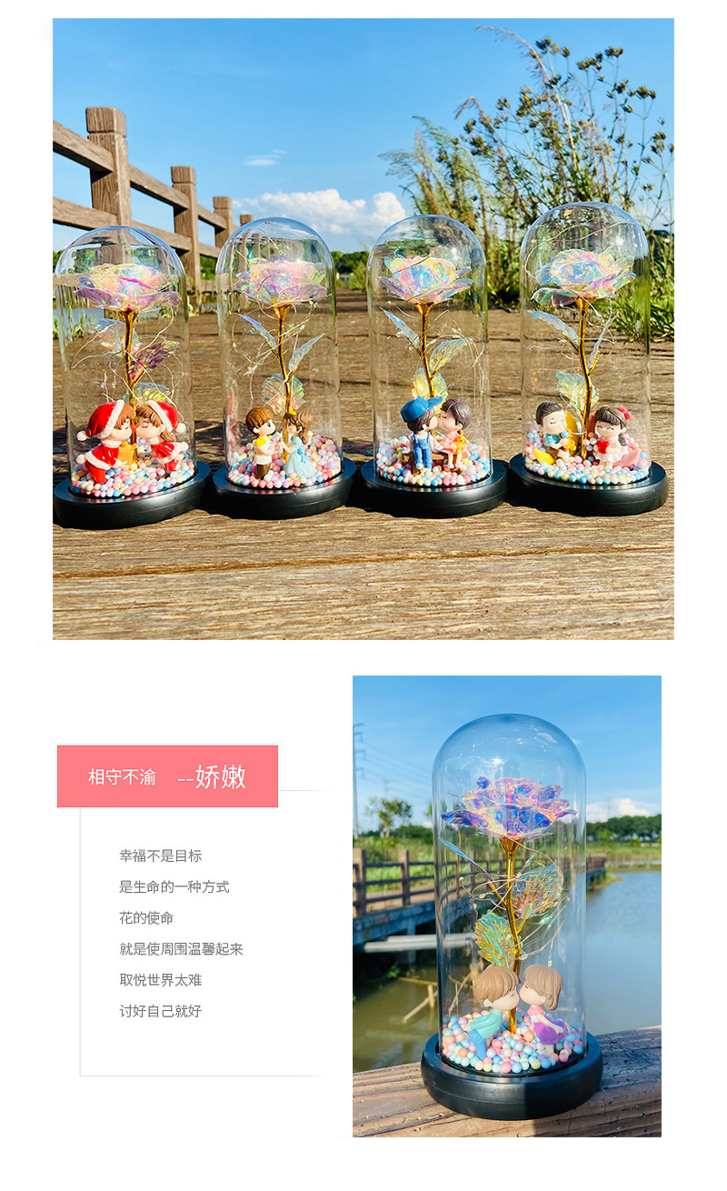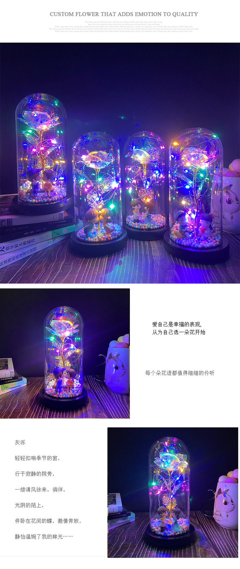金箔玫瑰花玻璃罩led发光玩偶款永生花 情人节礼物母亲节创意摆件