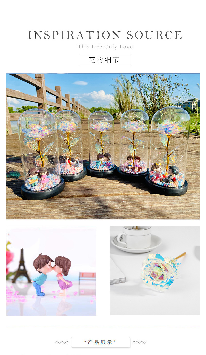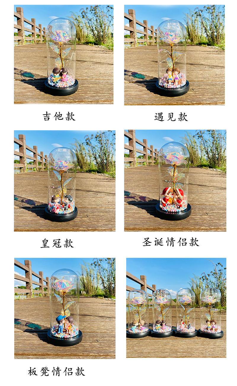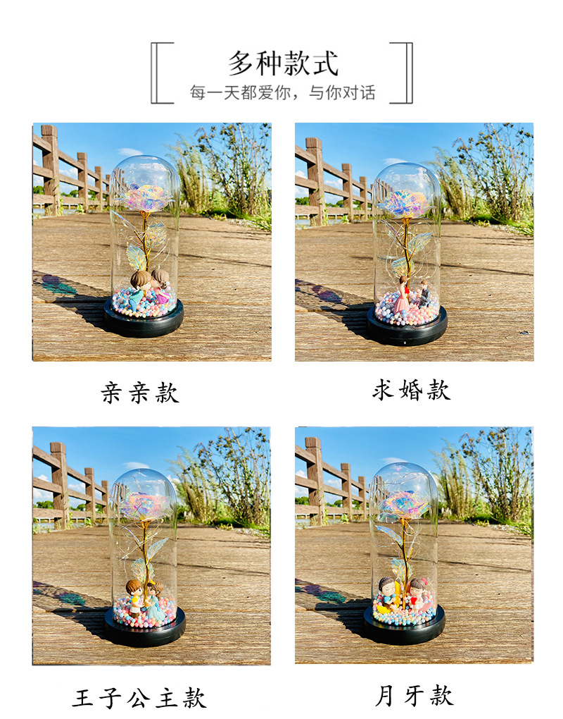 金箔玫瑰花玻璃罩led发光玩偶款永生花 情人节礼物母亲节创意摆件