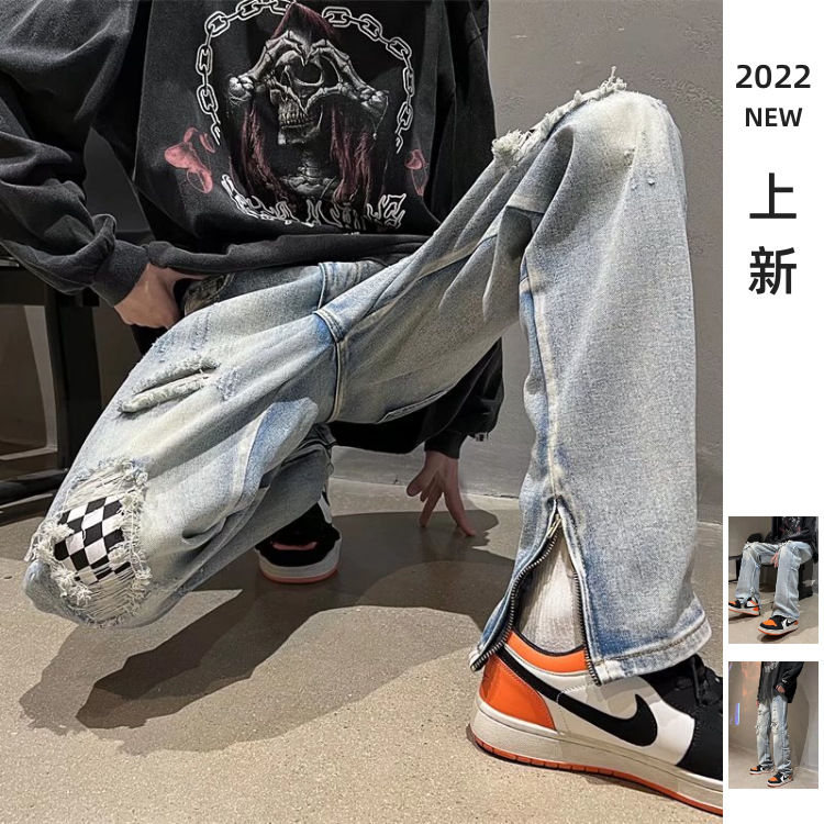 牛仔裤男批发 男士2022年新款潮牌九分破洞潮流浅色休闲长裤子