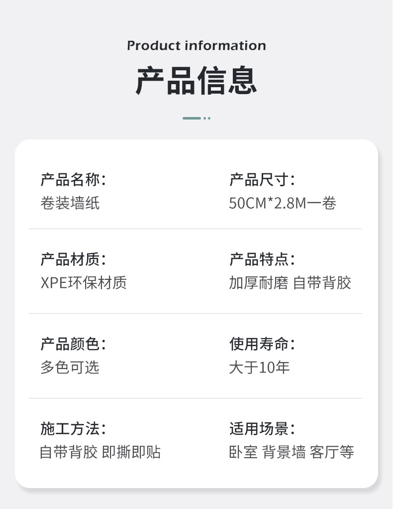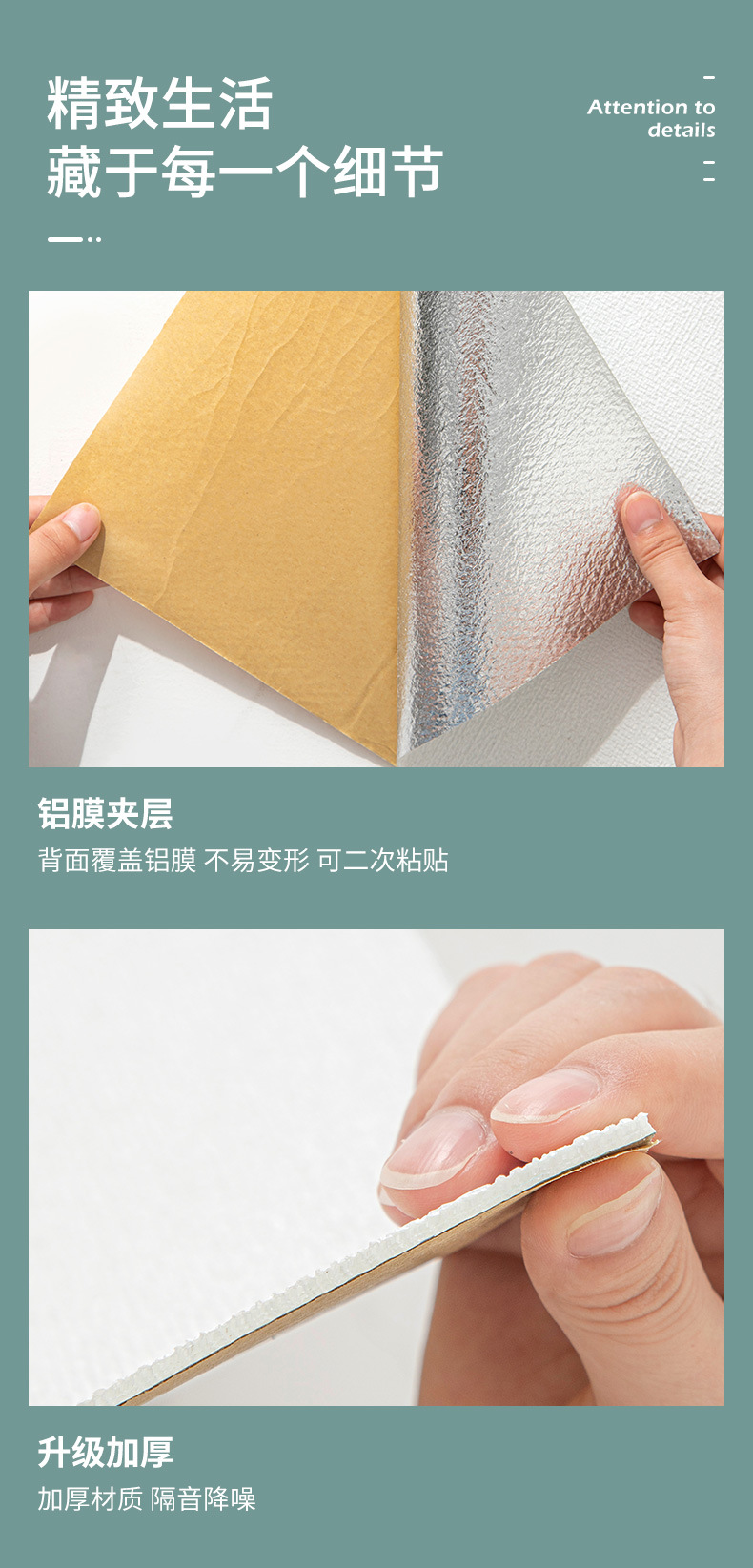 2:墙贴是由高密度发泡软包xpe材质,隔音,隔热,防撞,防水的,正面可以擦洗