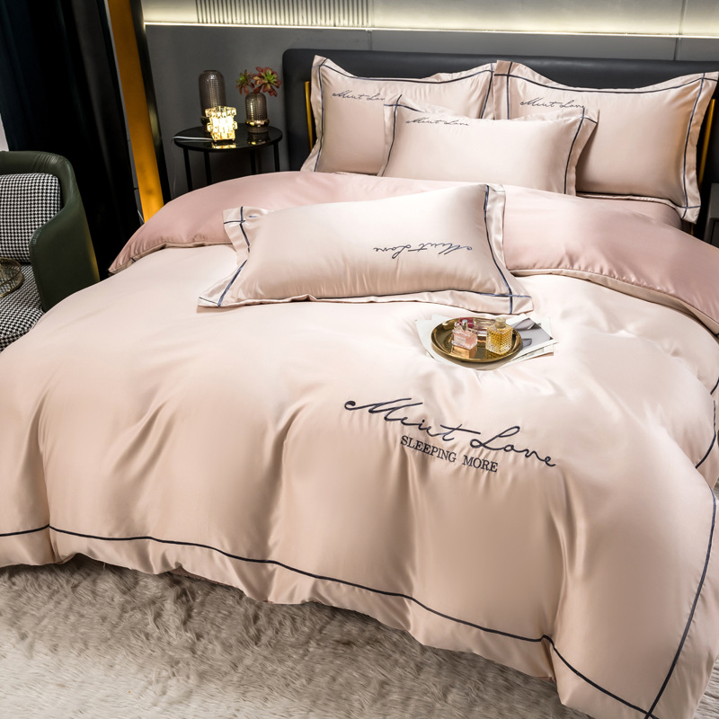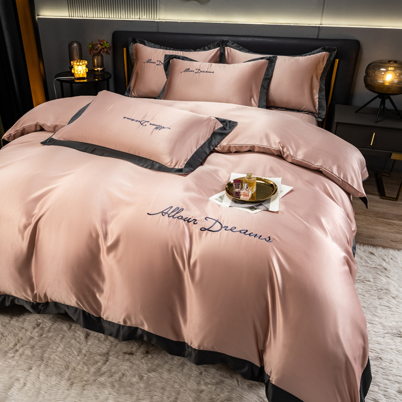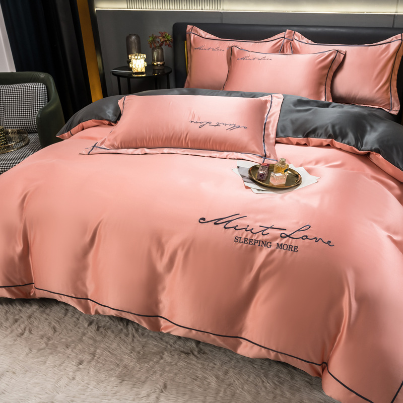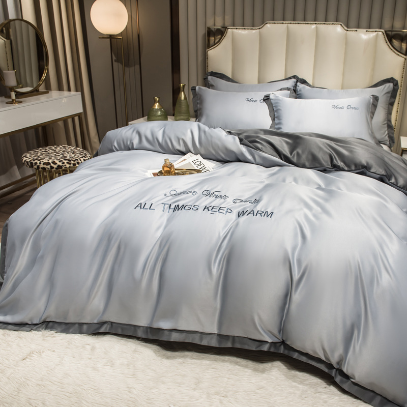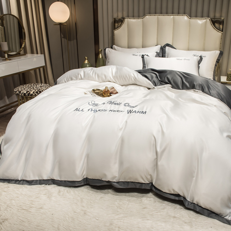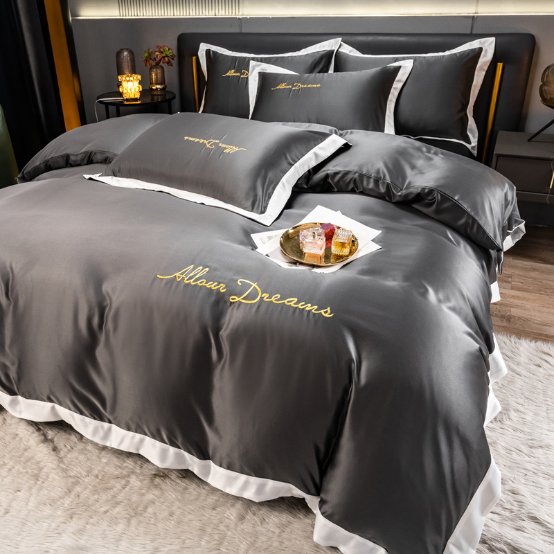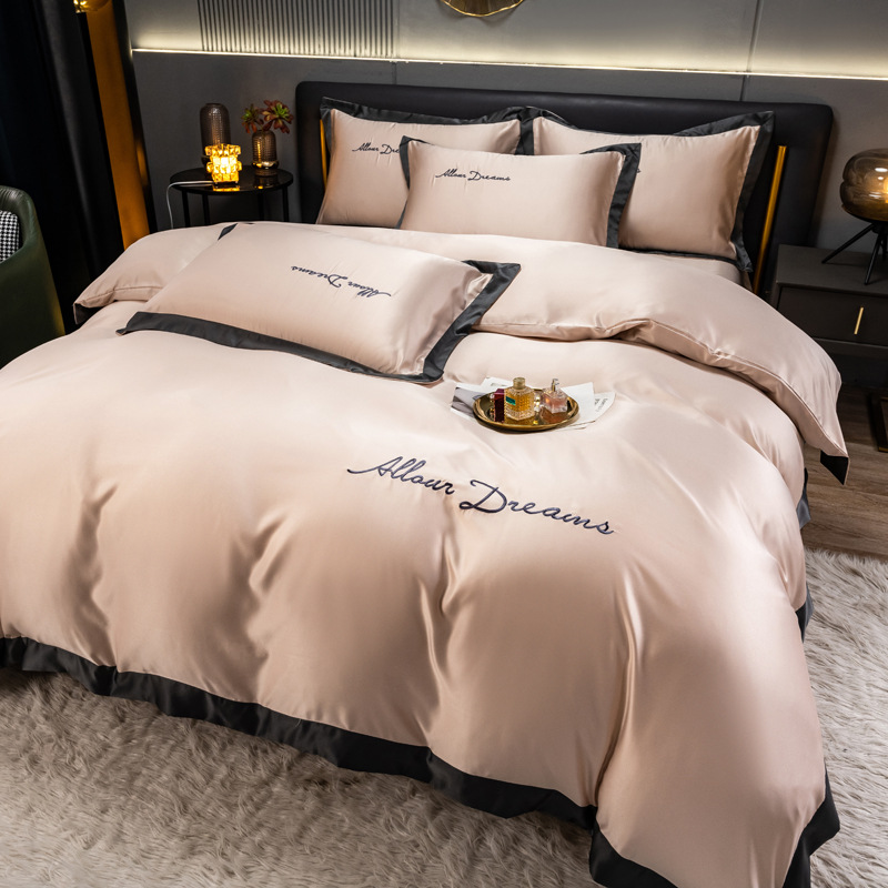欧式水洗真丝四件套纯色刺绣冰丝被套床上用品床单床笠三件套代发